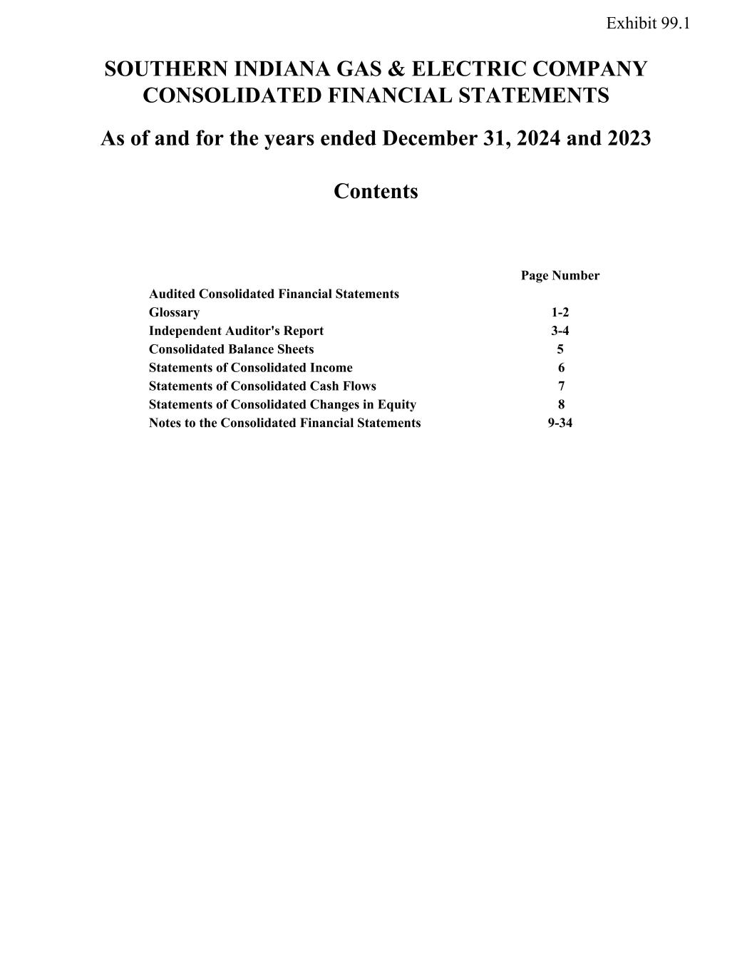 SOUTHERN INDIANA GAS & ELECTRIC COMPANY CONSOLIDATED FINANCIAL STATEMENTS As of and for the years ended December 31, 2024 and 2023 Contents Page Number Audited Consolidated Financial Statements Glossary 1-2 Independent Auditor's Report 3-4 Consolidated Balance Sheets 5 Statements of Consolidated Income 6 Statements of Consolidated Cash Flows 7 Statements of Consolidated Changes in Equity 8 Notes to the Consolidated Financial Statements 9-34 Exhibit 99.1