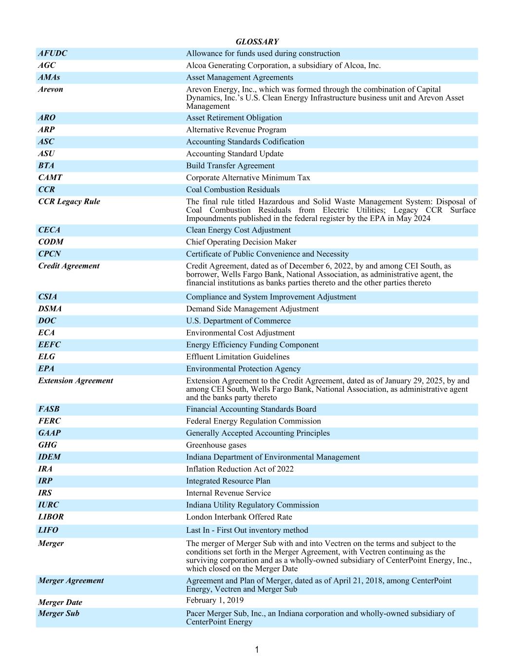 GLOSSARY AFUDC Allowance for funds used during construction AGC Alcoa Generating Corporation, a subsidiary of Alcoa, Inc. AMAs Asset Management Agreements Arevon Arevon Energy, Inc., which was formed through the combination of Capital Dynamics, Inc.’s U.S. Clean Energy Infrastructure business unit and Arevon Asset Management ARO Asset Retirement Obligation ARP Alternative Revenue Program ASC Accounting Standards Codification ASU Accounting Standard Update BTA Build Transfer Agreement CAMT Corporate Alternative Minimum Tax CCR Coal Combustion Residuals CCR Legacy Rule The final rule titled Hazardous and Solid Waste Management System: Disposal of Coal Combustion Residuals from Electric Utilities; Legacy CCR Surface Impoundments published in the federal register by the EPA in May 2024 CECA Clean Energy Cost Adjustment CODM Chief Operating Decision Maker CPCN Certificate of Public Convenience and Necessity Credit Agreement Credit Agreement, dated as of December 6, 2022, by and among CEI South, as borrower, Wells Fargo Bank, National Association, as administrative agent, the financial institutions as banks parties thereto and the other parties thereto CSIA Compliance and System Improvement Adjustment DSMA Demand Side Management Adjustment DOC U.S. Department of Commerce ECA Environmental Cost Adjustment EEFC Energy Efficiency Funding Component ELG Effluent Limitation Guidelines EPA Environmental Protection Agency Extension Agreement Extension Agreement to the Credit Agreement, dated as of January 29, 2025, by and among CEI South, Wells Fargo Bank, National Association, as administrative agent and the banks party thereto FASB Financial Accounting Standards Board FERC Federal Energy Regulation Commission GAAP Generally Accepted Accounting Principles GHG Greenhouse gases IDEM Indiana Department of Environmental Management IRA Inflation Reduction Act of 2022 IRP Integrated Resource Plan IRS Internal Revenue Service IURC Indiana Utility Regulatory Commission LIBOR London Interbank Offered Rate LIFO Last In - First Out inventory method Merger The merger of Merger Sub with and into Vectren on the terms and subject to the conditions set forth in the Merger Agreement, with Vectren continuing as the surviving corporation and as a wholly-owned subsidiary of CenterPoint Energy, Inc., which closed on the Merger Date Merger Agreement Agreement and Plan of Merger, dated as of April 21, 2018, among CenterPoint Energy, Vectren and Merger Sub Merger Date February 1, 2019 Merger Sub Pacer Merger Sub, Inc., an Indiana corporation and wholly-owned subsidiary of CenterPoint Energy 1