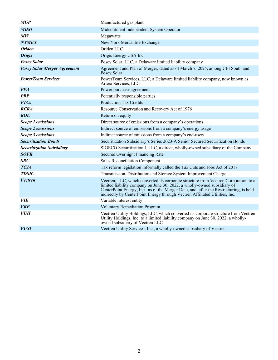 MGP Manufactured gas plant MISO Midcontinent Independent System Operator MW Megawatts NYMEX New York Mercantile Exchange Oriden Oriden LLC Origis Origis Energy USA Inc. Posey Solar Posey Solar, LLC, a Delaware limited liability company Posey Solar Merger Agreement Agreement and Plan of Merger, dated as of March 7, 2025, among CEI South and Posey Solar PowerTeam Services PowerTeam Services, LLC, a Delaware limited liability company, now known as Artera Services, LLC PPA Power purchase agreement PRP Potentially responsible parties PTCs Production Tax Credits RCRA Resource Conservation and Recovery Act of 1976 ROE Return on equity Scope 1 emissions Direct source of emissions from a company’s operations Scope 2 emissions Indirect source of emissions from a company’s energy usage Scope 3 emissions Indirect source of emissions from a company’s end-users Securitization Bonds Securitization Subsidiary’s Series 2023-A Senior Secured Securitization Bonds Securitization Subsidiary SIGECO Securitization I, LLC, a direct, wholly-owned subsidiary of the Company SOFR Secured Overnight Financing Rate SRC Sales Reconciliation Component TCJA Tax reform legislation informally called the Tax Cuts and Jobs Act of 2017 TDSIC Transmission, Distribution and Storage System Improvement Charge Vectren Vectren, LLC, which converted its corporate structure from Vectren Corporation to a limited liability company on June 30, 2022, a wholly-owned subsidiary of CenterPoint Energy, Inc. as of the Merger Date, and, after the Restructuring, is held indirectly by CenterPoint Energy through Vectren Affiliated Utilities, Inc. VIE Variable interest entity VRP Voluntary Remediation Program VUH Vectren Utility Holdings, LLC, which converted its corporate structure from Vectren Utility Holdings, Inc. to a limited liability company on June 30, 2022, a wholly- owned subsidiary of Vectren LLC VUSI Vectren Utility Services, Inc., a wholly-owned subsidiary of Vectren 2