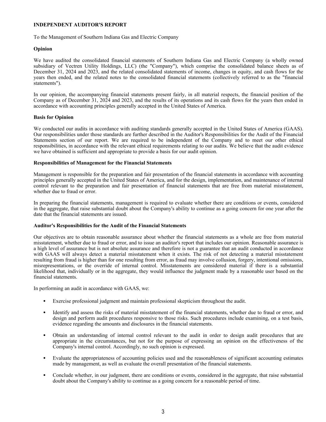 INDEPENDENT AUDITOR'S REPORT To the Management of Southern Indiana Gas and Electric Company Opinion We have audited the consolidated financial statements of Southern Indiana Gas and Electric Company (a wholly owned subsidiary of Vectren Utility Holdings, LLC) (the "Company"), which comprise the consolidated balance sheets as of December 31, 2024 and 2023, and the related consolidated statements of income, changes in equity, and cash flows for the years then ended, and the related notes to the consolidated financial statements (collectively referred to as the "financial statements"). In our opinion, the accompanying financial statements present fairly, in all material respects, the financial position of the Company as of December 31, 2024 and 2023, and the results of its operations and its cash flows for the years then ended in accordance with accounting principles generally accepted in the United States of America. Basis for Opinion We conducted our audits in accordance with auditing standards generally accepted in the United States of America (GAAS). Our responsibilities under those standards are further described in the Auditor's Responsibilities for the Audit of the Financial Statements section of our report. We are required to be independent of the Company and to meet our other ethical responsibilities, in accordance with the relevant ethical requirements relating to our audits. We believe that the audit evidence we have obtained is sufficient and appropriate to provide a basis for our audit opinion. Responsibilities of Management for the Financial Statements Management is responsible for the preparation and fair presentation of the financial statements in accordance with accounting principles generally accepted in the United States of America, and for the design, implementation, and maintenance of internal control relevant to the preparation and fair presentation of financial statements that are free from material misstatement, whether due to fraud or error. In preparing the financial statements, management is required to evaluate whether there are conditions or events, considered in the aggregate, that raise substantial doubt about the Company's ability to continue as a going concern for one year after the date that the financial statements are issued. Auditor's Responsibilities for the Audit of the Financial Statements Our objectives are to obtain reasonable assurance about whether the financial statements as a whole are free from material misstatement, whether due to fraud or error, and to issue an auditor's report that includes our opinion. Reasonable assurance is a high level of assurance but is not absolute assurance and therefore is not a guarantee that an audit conducted in accordance with GAAS will always detect a material misstatement when it exists. The risk of not detecting a material misstatement resulting from fraud is higher than for one resulting from error, as fraud may involve collusion, forgery, intentional omissions, misrepresentations, or the override of internal control. Misstatements are considered material if there is a substantial likelihood that, individually or in the aggregate, they would influence the judgment made by a reasonable user based on the financial statements. In performing an audit in accordance with GAAS, we: • Exercise professional judgment and maintain professional skepticism throughout the audit. • Identify and assess the risks of material misstatement of the financial statements, whether due to fraud or error, and design and perform audit procedures responsive to those risks. Such procedures include examining, on a test basis, evidence regarding the amounts and disclosures in the financial statements. • Obtain an understanding of internal control relevant to the audit in order to design audit procedures that are appropriate in the circumstances, but not for the purpose of expressing an opinion on the effectiveness of the Company's internal control. Accordingly, no such opinion is expressed. • Evaluate the appropriateness of accounting policies used and the reasonableness of significant accounting estimates made by management, as well as evaluate the overall presentation of the financial statements. • Conclude whether, in our judgment, there are conditions or events, considered in the aggregate, that raise substantial doubt about the Company's ability to continue as a going concern for a reasonable period of time. 3