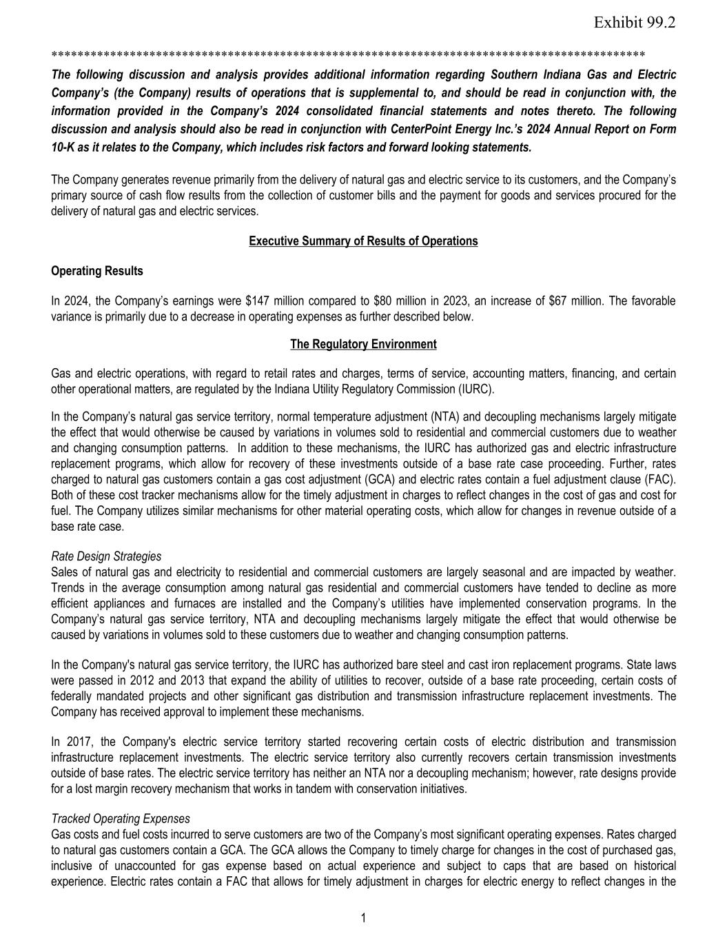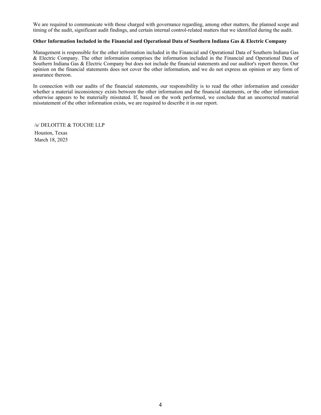 We are required to communicate with those charged with governance regarding, among other matters, the planned scope and timing of the audit, significant audit findings, and certain internal control-related matters that we identified during the audit. Other Information Included in the Financial and Operational Data of Southern Indiana Gas & Electric Company Management is responsible for the other information included in the Financial and Operational Data of Southern Indiana Gas & Electric Company. The other information comprises the information included in the Financial and Operational Data of Southern Indiana Gas & Electric Company but does not include the financial statements and our auditor's report thereon. Our opinion on the financial statements does not cover the other information, and we do not express an opinion or any form of assurance thereon. In connection with our audits of the financial statements, our responsibility is to read the other information and consider whether a material inconsistency exists between the other information and the financial statements, or the other information otherwise appears to be materially misstated. If, based on the work performed, we conclude that an uncorrected material misstatement of the other information exists, we are required to describe it in our report. /s/ DELOITTE & TOUCHE LLP Houston, Texas March 18, 2025 4