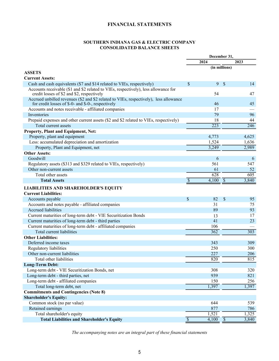 FINANCIAL STATEMENTS SOUTHERN INDIANA GAS & ELECTRIC COMPANY CONSOLIDATED BALANCE SHEETS December 31, 2024 2023 (in millions) ASSETS Current Assets: Cash and cash equivalents ($7 and $14 related to VIEs, respectively) $ 9 $ 14 Accounts receivable ($1 and $2 related to VIEs, respectively), less allowance for credit losses of $2 and $2, respectively 54 47 Accrued unbilled revenues ($2 and $2 related to VIEs, respectively), less allowance for credit losses of $-0- and $-0-, respectively 46 45 Accounts and notes receivable - affiliated companies 17 — Inventories 79 96 Prepaid expenses and other current assets ($2 and $2 related to VIEs, respectively) 18 44 Total current assets 223 246 Property, Plant and Equipment, Net: Property, plant and equipment 4,773 4,625 Less: accumulated depreciation and amortization 1,524 1,636 Property, Plant and Equipment, net 3,249 2,989 Other Assets: Goodwill 6 6 Regulatory assets ($313 and $329 related to VIEs, respectively) 561 547 Other non-current assets 61 52 Total other assets 628 605 Total Assets $ 4,100 $ 3,840 LIABILITIES AND SHAREHOLDER'S EQUITY Current Liabilities: Accounts payable $ 82 $ 95 Accounts and notes payable - affiliated companies 31 75 Accrued liabilities 89 93 Current maturities of long-term debt - VIE Securitization Bonds 13 17 Current maturities of long-term debt - third parties 41 23 Current maturities of long-term debt - affiliated companies 106 — Total current liabilities 362 303 Other Liabilities: Deferred income taxes 343 309 Regulatory liabilities 250 300 Other non-current liabilities 227 206 Total other liabilities 820 815 Long-Term Debt: Long-term debt - VIE Securitization Bonds, net 308 320 Long-term debt - third parties, net 939 821 Long-term debt - affiliated companies 150 256 Total long-term debt, net 1,397 1,397 Commitments and Contingencies (Note 8) Shareholder's Equity: Common stock (no par value) 644 539 Retained earnings 877 786 Total shareholder's equity 1,521 1,325 Total Liabilities and Shareholder's Equity $ 4,100 $ 3,840 The accompanying notes are an integral part of these financial statements 5