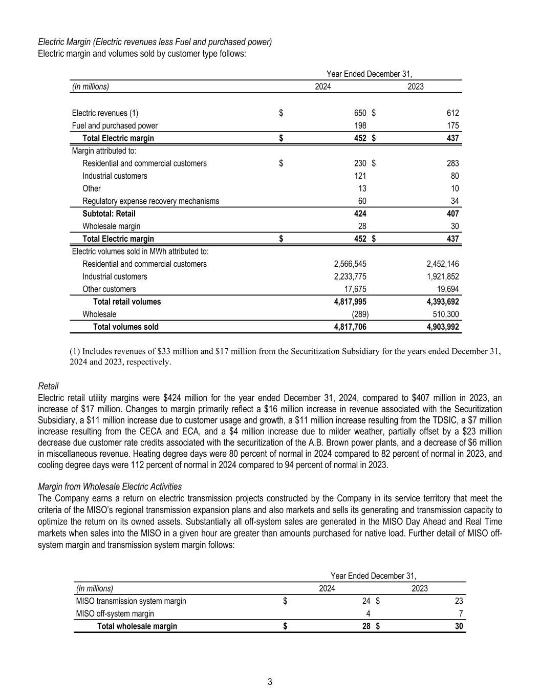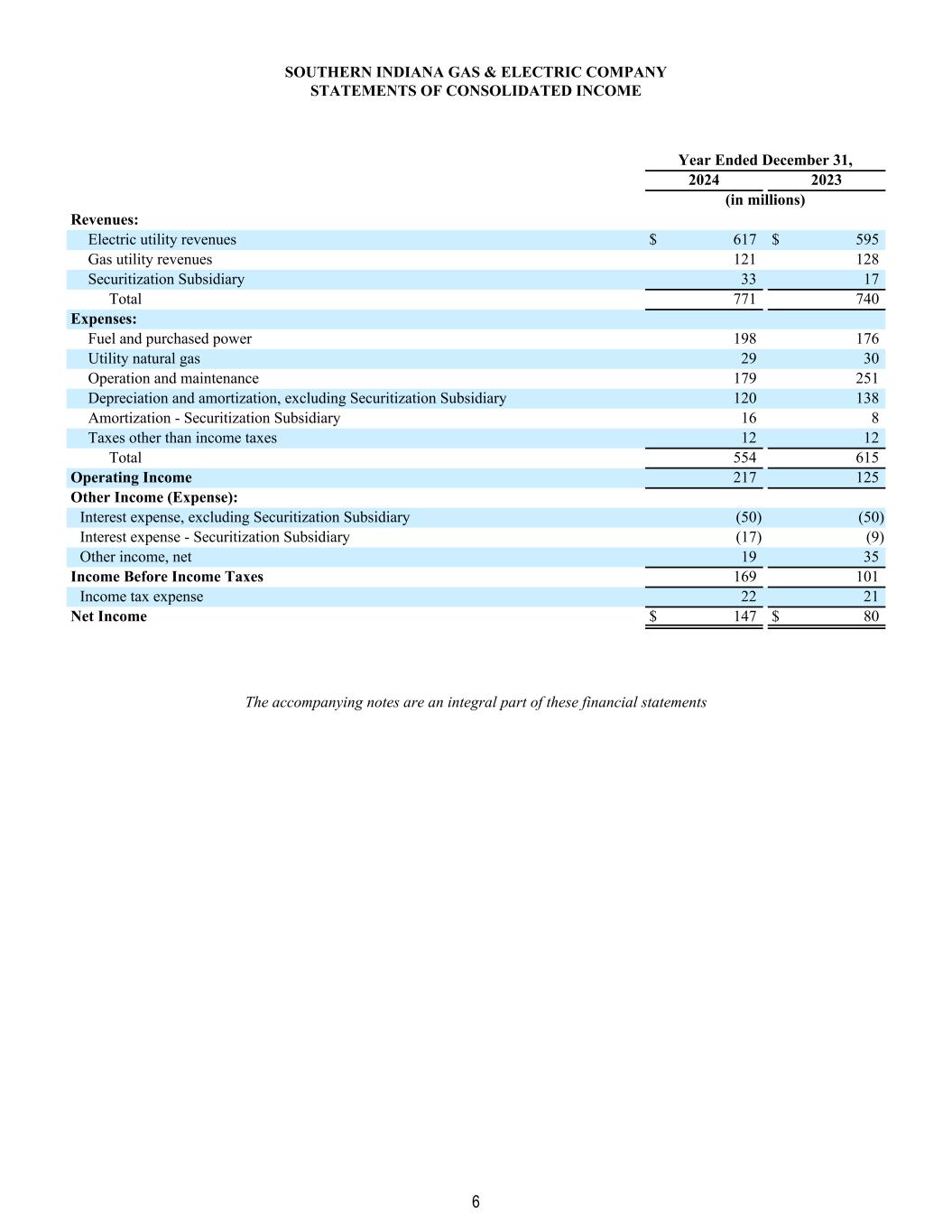 SOUTHERN INDIANA GAS & ELECTRIC COMPANY STATEMENTS OF CONSOLIDATED INCOME Year Ended December 31, 2024 2023 (in millions) Revenues: Electric utility revenues $ 617 $ 595 Gas utility revenues 121 128 Securitization Subsidiary 33 17 Total 771 740 Expenses: Fuel and purchased power 198 176 Utility natural gas 29 30 Operation and maintenance 179 251 Depreciation and amortization, excluding Securitization Subsidiary 120 138 Amortization - Securitization Subsidiary 16 8 Taxes other than income taxes 12 12 Total 554 615 Operating Income 217 125 Other Income (Expense): Interest expense, excluding Securitization Subsidiary (50) (50) Interest expense - Securitization Subsidiary (17) (9) Other income, net 19 35 Income Before Income Taxes 169 101 Income tax expense 22 21 Net Income $ 147 $ 80 The accompanying notes are an integral part of these financial statements 6