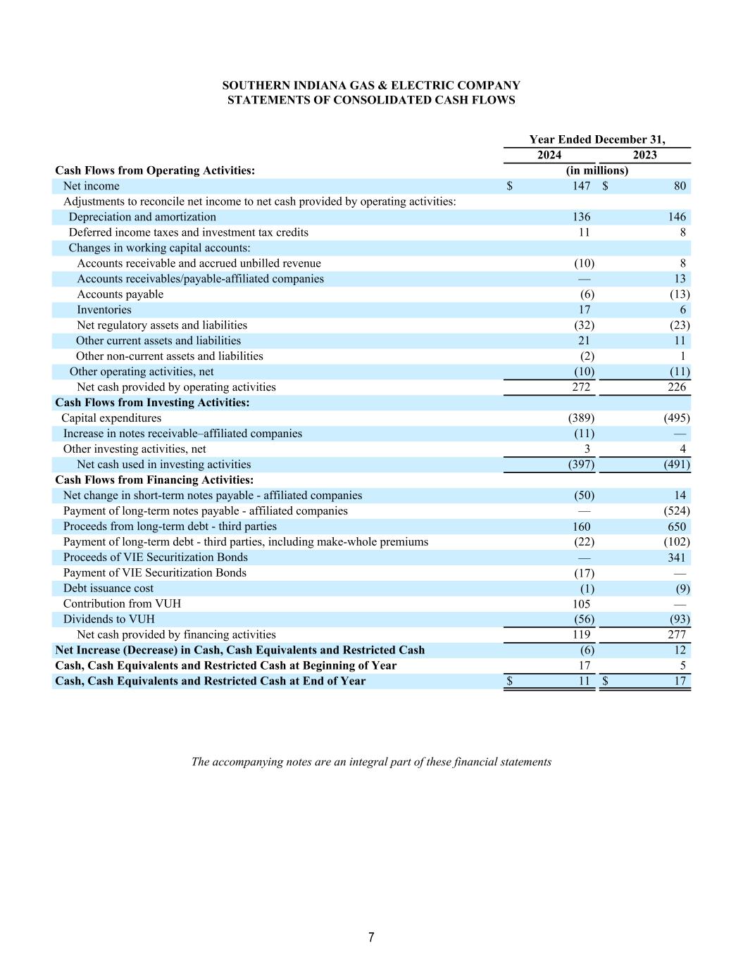 SOUTHERN INDIANA GAS & ELECTRIC COMPANY STATEMENTS OF CONSOLIDATED CASH FLOWS Year Ended December 31, 2024 2023 Cash Flows from Operating Activities: (in millions) Net income $ 147 $ 80 Adjustments to reconcile net income to net cash provided by operating activities: Depreciation and amortization 136 146 Deferred income taxes and investment tax credits 11 8 Changes in working capital accounts: Accounts receivable and accrued unbilled revenue (10) 8 Accounts receivables/payable-affiliated companies — 13 Accounts payable (6) (13) Inventories 17 6 Net regulatory assets and liabilities (32) (23) Other current assets and liabilities 21 11 Other non-current assets and liabilities (2) 1 Other operating activities, net (10) (11) Net cash provided by operating activities 272 226 Cash Flows from Investing Activities: Capital expenditures (389) (495) Increase in notes receivable–affiliated companies (11) — Other investing activities, net 3 4 Net cash used in investing activities (397) (491) Cash Flows from Financing Activities: Net change in short-term notes payable - affiliated companies (50) 14 Payment of long-term notes payable - affiliated companies — (524) Proceeds from long-term debt - third parties 160 650 Payment of long-term debt - third parties, including make-whole premiums (22) (102) Proceeds of VIE Securitization Bonds — 341 Payment of VIE Securitization Bonds (17) — Debt issuance cost (1) (9) Contribution from VUH 105 — Dividends to VUH (56) (93) Net cash provided by financing activities 119 277 Net Increase (Decrease) in Cash, Cash Equivalents and Restricted Cash (6) 12 Cash, Cash Equivalents and Restricted Cash at Beginning of Year 17 5 Cash, Cash Equivalents and Restricted Cash at End of Year $ 11 $ 17 The accompanying notes are an integral part of these financial statements 7