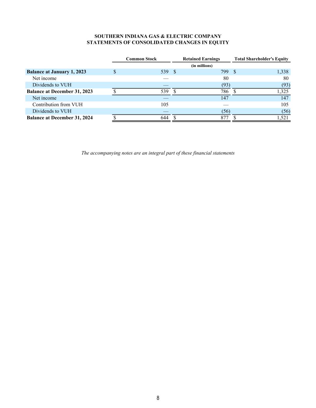 SOUTHERN INDIANA GAS & ELECTRIC COMPANY STATEMENTS OF CONSOLIDATED CHANGES IN EQUITY Common Stock Retained Earnings Total Shareholder's Equity (in millions) Balance at January 1, 2023 $ 539 $ 799 $ 1,338 Net income — 80 80 Dividends to VUH — (93) (93) Balance at December 31, 2023 $ 539 $ 786 $ 1,325 Net income — 147 147 Contribution from VUH 105 — 105 Dividends to VUH — (56) (56) Balance at December 31, 2024 $ 644 $ 877 $ 1,521 The accompanying notes are an integral part of these financial statements 8
