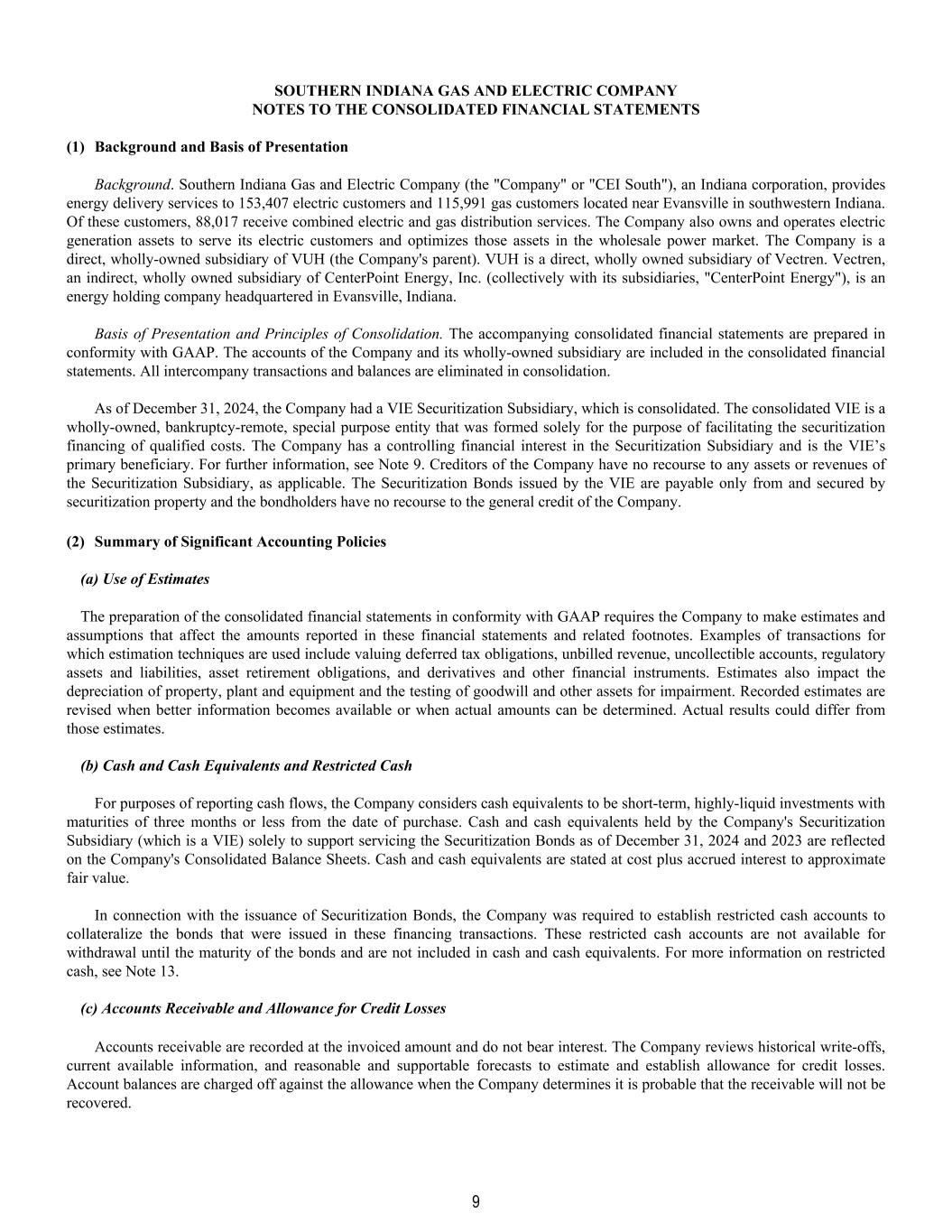 SOUTHERN INDIANA GAS AND ELECTRIC COMPANY NOTES TO THE CONSOLIDATED FINANCIAL STATEMENTS (1) Background and Basis of Presentation Background. Southern Indiana Gas and Electric Company (the "Company" or "CEI South"), an Indiana corporation, provides energy delivery services to 153,407 electric customers and 115,991 gas customers located near Evansville in southwestern Indiana. Of these customers, 88,017 receive combined electric and gas distribution services. The Company also owns and operates electric generation assets to serve its electric customers and optimizes those assets in the wholesale power market. The Company is a direct, wholly-owned subsidiary of VUH (the Company's parent). VUH is a direct, wholly owned subsidiary of Vectren. Vectren, an indirect, wholly owned subsidiary of CenterPoint Energy, Inc. (collectively with its subsidiaries, "CenterPoint Energy"), is an energy holding company headquartered in Evansville, Indiana. Basis of Presentation and Principles of Consolidation. The accompanying consolidated financial statements are prepared in conformity with GAAP. The accounts of the Company and its wholly-owned subsidiary are included in the consolidated financial statements. All intercompany transactions and balances are eliminated in consolidation. As of December 31, 2024, the Company had a VIE Securitization Subsidiary, which is consolidated. The consolidated VIE is a wholly-owned, bankruptcy-remote, special purpose entity that was formed solely for the purpose of facilitating the securitization financing of qualified costs. The Company has a controlling financial interest in the Securitization Subsidiary and is the VIE’s primary beneficiary. For further information, see Note 9. Creditors of the Company have no recourse to any assets or revenues of the Securitization Subsidiary, as applicable. The Securitization Bonds issued by the VIE are payable only from and secured by securitization property and the bondholders have no recourse to the general credit of the Company. (2) Summary of Significant Accounting Policies (a) Use of Estimates The preparation of the consolidated financial statements in conformity with GAAP requires the Company to make estimates and assumptions that affect the amounts reported in these financial statements and related footnotes. Examples of transactions for which estimation techniques are used include valuing deferred tax obligations, unbilled revenue, uncollectible accounts, regulatory assets and liabilities, asset retirement obligations, and derivatives and other financial instruments. Estimates also impact the depreciation of property, plant and equipment and the testing of goodwill and other assets for impairment. Recorded estimates are revised when better information becomes available or when actual amounts can be determined. Actual results could differ from those estimates. (b) Cash and Cash Equivalents and Restricted Cash For purposes of reporting cash flows, the Company considers cash equivalents to be short-term, highly-liquid investments with maturities of three months or less from the date of purchase. Cash and cash equivalents held by the Company's Securitization Subsidiary (which is a VIE) solely to support servicing the Securitization Bonds as of December 31, 2024 and 2023 are reflected on the Company's Consolidated Balance Sheets. Cash and cash equivalents are stated at cost plus accrued interest to approximate fair value. In connection with the issuance of Securitization Bonds, the Company was required to establish restricted cash accounts to collateralize the bonds that were issued in these financing transactions. These restricted cash accounts are not available for withdrawal until the maturity of the bonds and are not included in cash and cash equivalents. For more information on restricted cash, see Note 13. (c) Accounts Receivable and Allowance for Credit Losses Accounts receivable are recorded at the invoiced amount and do not bear interest. The Company reviews historical write-offs, current available information, and reasonable and supportable forecasts to estimate and establish allowance for credit losses. Account balances are charged off against the allowance when the Company determines it is probable that the receivable will not be recovered. 9