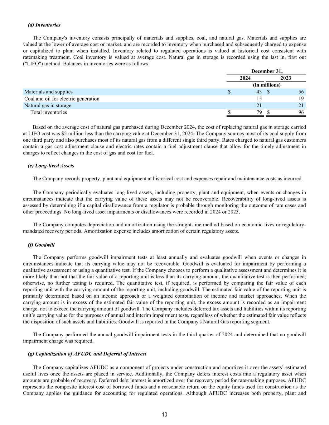 (d) Inventories The Company's inventory consists principally of materials and supplies, coal, and natural gas. Materials and supplies are valued at the lower of average cost or market, and are recorded to inventory when purchased and subsequently charged to expense or capitalized to plant when installed. Inventory related to regulated operations is valued at historical cost consistent with ratemaking treatment. Coal inventory is valued at average cost. Natural gas in storage is recorded using the last in, first out ("LIFO") method. Balances in inventories were as follows: December 31, 2024 2023 (in millions) Materials and supplies $ 43 $ 56 Coal and oil for electric generation 15 19 Natural gas in storage 21 21 Total inventories $ 79 $ 96 Based on the average cost of natural gas purchased during December 2024, the cost of replacing natural gas in storage carried at LIFO cost was $5 million less than the carrying value at December 31, 2024. The Company sources most of its coal supply from one third party and also purchases most of its natural gas from a different single third party. Rates charged to natural gas customers contain a gas cost adjustment clause and electric rates contain a fuel adjustment clause that allow for the timely adjustment in charges to reflect changes in the cost of gas and cost for fuel. (e) Long-lived Assets The Company records property, plant and equipment at historical cost and expenses repair and maintenance costs as incurred. The Company periodically evaluates long-lived assets, including property, plant and equipment, when events or changes in circumstances indicate that the carrying value of these assets may not be recoverable. Recoverability of long-lived assets is assessed by determining if a capital disallowance from a regulator is probable through monitoring the outcome of rate cases and other proceedings. No long-lived asset impairments or disallowances were recorded in 2024 or 2023. The Company computes depreciation and amortization using the straight-line method based on economic lives or regulatory- mandated recovery periods. Amortization expense includes amortization of certain regulatory assets. (f) Goodwill The Company performs goodwill impairment tests at least annually and evaluates goodwill when events or changes in circumstances indicate that its carrying value may not be recoverable. Goodwill is evaluated for impairment by performing a qualitative assessment or using a quantitative test. If the Company chooses to perform a qualitative assessment and determines it is more likely than not that the fair value of a reporting unit is less than its carrying amount, the quantitative test is then performed; otherwise, no further testing is required. The quantitative test, if required, is performed by comparing the fair value of each reporting unit with the carrying amount of the reporting unit, including goodwill. The estimated fair value of the reporting unit is primarily determined based on an income approach or a weighted combination of income and market approaches. When the carrying amount is in excess of the estimated fair value of the reporting unit, the excess amount is recorded as an impairment charge, not to exceed the carrying amount of goodwill. The Company includes deferred tax assets and liabilities within its reporting unit’s carrying value for the purposes of annual and interim impairment tests, regardless of whether the estimated fair value reflects the disposition of such assets and liabilities. Goodwill is reported in the Company's Natural Gas reporting segment. The Company performed the annual goodwill impairment tests in the third quarter of 2024 and determined that no goodwill impairment charge was required. (g) Capitalization of AFUDC and Deferral of Interest The Company capitalizes AFUDC as a component of projects under construction and amortizes it over the assets’ estimated useful lives once the assets are placed in service. Additionally, the Company defers interest costs into a regulatory asset when amounts are probable of recovery. Deferred debt interest is amortized over the recovery period for rate-making purposes. AFUDC represents the composite interest cost of borrowed funds and a reasonable return on the equity funds used for construction as the Company applies the guidance for accounting for regulated operations. Although AFUDC increases both property, plant and 10