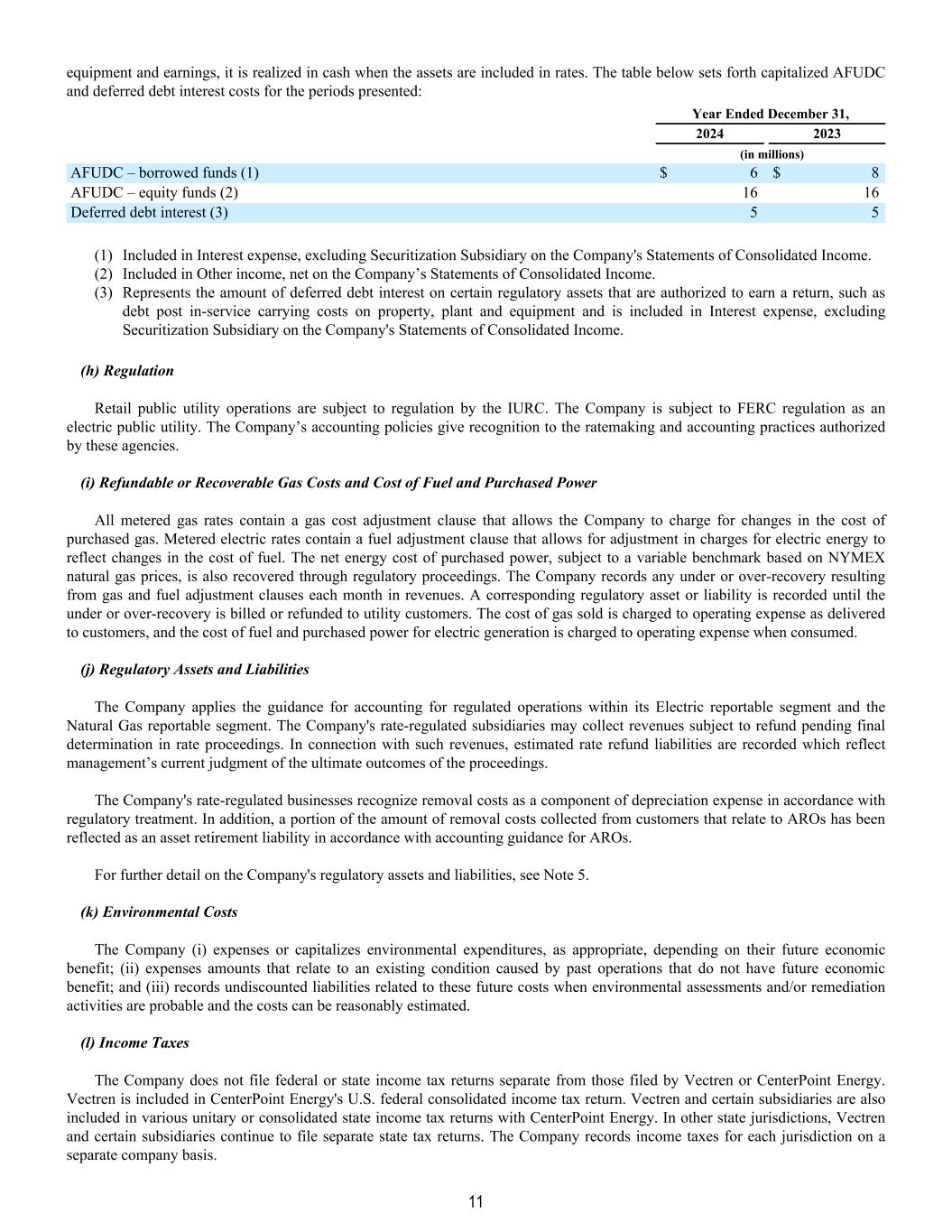 equipment and earnings, it is realized in cash when the assets are included in rates. The table below sets forth capitalized AFUDC and deferred debt interest costs for the periods presented: Year Ended December 31, 2024 2023 (in millions) AFUDC – borrowed funds (1) $ 6 $ 8 AFUDC – equity funds (2) 16 16 Deferred debt interest (3) 5 5 (1) Included in Interest expense, excluding Securitization Subsidiary on the Company's Statements of Consolidated Income. (2) Included in Other income, net on the Company’s Statements of Consolidated Income. (3) Represents the amount of deferred debt interest on certain regulatory assets that are authorized to earn a return, such as debt post in-service carrying costs on property, plant and equipment and is included in Interest expense, excluding Securitization Subsidiary on the Company's Statements of Consolidated Income. (h) Regulation Retail public utility operations are subject to regulation by the IURC. The Company is subject to FERC regulation as an electric public utility. The Company’s accounting policies give recognition to the ratemaking and accounting practices authorized by these agencies. (i) Refundable or Recoverable Gas Costs and Cost of Fuel and Purchased Power All metered gas rates contain a gas cost adjustment clause that allows the Company to charge for changes in the cost of purchased gas. Metered electric rates contain a fuel adjustment clause that allows for adjustment in charges for electric energy to reflect changes in the cost of fuel. The net energy cost of purchased power, subject to a variable benchmark based on NYMEX natural gas prices, is also recovered through regulatory proceedings. The Company records any under or over-recovery resulting from gas and fuel adjustment clauses each month in revenues. A corresponding regulatory asset or liability is recorded until the under or over-recovery is billed or refunded to utility customers. The cost of gas sold is charged to operating expense as delivered to customers, and the cost of fuel and purchased power for electric generation is charged to operating expense when consumed. (j) Regulatory Assets and Liabilities The Company applies the guidance for accounting for regulated operations within its Electric reportable segment and the Natural Gas reportable segment. The Company's rate-regulated subsidiaries may collect revenues subject to refund pending final determination in rate proceedings. In connection with such revenues, estimated rate refund liabilities are recorded which reflect management’s current judgment of the ultimate outcomes of the proceedings. The Company's rate-regulated businesses recognize removal costs as a component of depreciation expense in accordance with regulatory treatment. In addition, a portion of the amount of removal costs collected from customers that relate to AROs has been reflected as an asset retirement liability in accordance with accounting guidance for AROs. For further detail on the Company's regulatory assets and liabilities, see Note 5. (k) Environmental Costs The Company (i) expenses or capitalizes environmental expenditures, as appropriate, depending on their future economic benefit; (ii) expenses amounts that relate to an existing condition caused by past operations that do not have future economic benefit; and (iii) records undiscounted liabilities related to these future costs when environmental assessments and/or remediation activities are probable and the costs can be reasonably estimated. (l) Income Taxes The Company does not file federal or state income tax returns separate from those filed by Vectren or CenterPoint Energy. Vectren is included in CenterPoint Energy's U.S. federal consolidated income tax return. Vectren and certain subsidiaries are also included in various unitary or consolidated state income tax returns with CenterPoint Energy. In other state jurisdictions, Vectren and certain subsidiaries continue to file separate state tax returns. The Company records income taxes for each jurisdiction on a separate company basis. 11