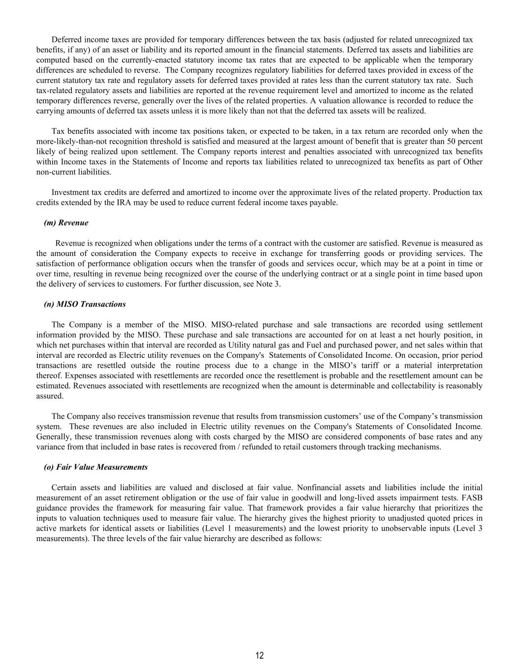 Deferred income taxes are provided for temporary differences between the tax basis (adjusted for related unrecognized tax benefits, if any) of an asset or liability and its reported amount in the financial statements. Deferred tax assets and liabilities are computed based on the currently-enacted statutory income tax rates that are expected to be applicable when the temporary differences are scheduled to reverse. The Company recognizes regulatory liabilities for deferred taxes provided in excess of the current statutory tax rate and regulatory assets for deferred taxes provided at rates less than the current statutory tax rate. Such tax-related regulatory assets and liabilities are reported at the revenue requirement level and amortized to income as the related temporary differences reverse, generally over the lives of the related properties. A valuation allowance is recorded to reduce the carrying amounts of deferred tax assets unless it is more likely than not that the deferred tax assets will be realized. Tax benefits associated with income tax positions taken, or expected to be taken, in a tax return are recorded only when the more-likely-than-not recognition threshold is satisfied and measured at the largest amount of benefit that is greater than 50 percent likely of being realized upon settlement. The Company reports interest and penalties associated with unrecognized tax benefits within Income taxes in the Statements of Income and reports tax liabilities related to unrecognized tax benefits as part of Other non-current liabilities. Investment tax credits are deferred and amortized to income over the approximate lives of the related property. Production tax credits extended by the IRA may be used to reduce current federal income taxes payable. (m) Revenue Revenue is recognized when obligations under the terms of a contract with the customer are satisfied. Revenue is measured as the amount of consideration the Company expects to receive in exchange for transferring goods or providing services. The satisfaction of performance obligation occurs when the transfer of goods and services occur, which may be at a point in time or over time, resulting in revenue being recognized over the course of the underlying contract or at a single point in time based upon the delivery of services to customers. For further discussion, see Note 3. (n) MISO Transactions The Company is a member of the MISO. MISO-related purchase and sale transactions are recorded using settlement information provided by the MISO. These purchase and sale transactions are accounted for on at least a net hourly position, in which net purchases within that interval are recorded as Utility natural gas and Fuel and purchased power, and net sales within that interval are recorded as Electric utility revenues on the Company's Statements of Consolidated Income. On occasion, prior period transactions are resettled outside the routine process due to a change in the MISO’s tariff or a material interpretation thereof. Expenses associated with resettlements are recorded once the resettlement is probable and the resettlement amount can be estimated. Revenues associated with resettlements are recognized when the amount is determinable and collectability is reasonably assured. The Company also receives transmission revenue that results from transmission customers’ use of the Company’s transmission system. These revenues are also included in Electric utility revenues on the Company's Statements of Consolidated Income. Generally, these transmission revenues along with costs charged by the MISO are considered components of base rates and any variance from that included in base rates is recovered from / refunded to retail customers through tracking mechanisms. (o) Fair Value Measurements Certain assets and liabilities are valued and disclosed at fair value. Nonfinancial assets and liabilities include the initial measurement of an asset retirement obligation or the use of fair value in goodwill and long-lived assets impairment tests. FASB guidance provides the framework for measuring fair value. That framework provides a fair value hierarchy that prioritizes the inputs to valuation techniques used to measure fair value. The hierarchy gives the highest priority to unadjusted quoted prices in active markets for identical assets or liabilities (Level 1 measurements) and the lowest priority to unobservable inputs (Level 3 measurements). The three levels of the fair value hierarchy are described as follows: 12
