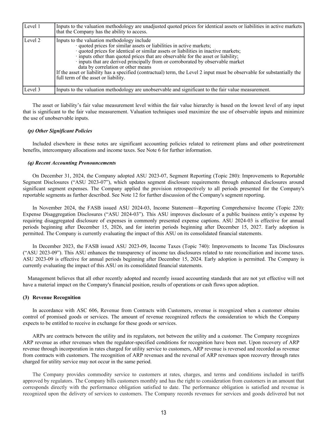 Level 1 Inputs to the valuation methodology are unadjusted quoted prices for identical assets or liabilities in active markets that the Company has the ability to access. Level 2 Inputs to the valuation methodology include · quoted prices for similar assets or liabilities in active markets; · quoted prices for identical or similar assets or liabilities in inactive markets; · inputs other than quoted prices that are observable for the asset or liability; · inputs that are derived principally from or corroborated by observable market data by correlation or other means If the asset or liability has a specified (contractual) term, the Level 2 input must be observable for substantially the full term of the asset or liability. Level 3 Inputs to the valuation methodology are unobservable and significant to the fair value measurement. The asset or liability’s fair value measurement level within the fair value hierarchy is based on the lowest level of any input that is significant to the fair value measurement. Valuation techniques used maximize the use of observable inputs and minimize the use of unobservable inputs. (p) Other Significant Policies Included elsewhere in these notes are significant accounting policies related to retirement plans and other postretirement benefits, intercompany allocations and income taxes. See Note 6 for further information. (q) Recent Accounting Pronouncements On December 31, 2024, the Company adopted ASU 2023-07, Segment Reporting (Topic 280): Improvements to Reportable Segment Disclosures (“ASU 2023-07”), which updates segment disclosure requirements through enhanced disclosures around significant segment expenses. The Company applied the provision retrospectively to all periods presented for the Company's reportable segments as further described. See Note 12 for further discussion of the Company's segment reporting. In November 2024, the FASB issued ASU 2024-03, Income Statement—Reporting Comprehensive Income (Topic 220): Expense Disaggregation Disclosures (“ASU 2024-03”). This ASU improves disclosure of a public business entity’s expense by requiring disaggregated disclosure of expenses in commonly presented expense captions. ASU 2024-03 is effective for annual periods beginning after December 15, 2026, and for interim periods beginning after December 15, 2027. Early adoption is permitted. The Company is currently evaluating the impact of this ASU on its consolidated financial statements. In December 2023, the FASB issued ASU 2023-09, Income Taxes (Topic 740): Improvements to Income Tax Disclosures (“ASU 2023-09”). This ASU enhances the transparency of income tax disclosures related to rate reconciliation and income taxes. ASU 2023-09 is effective for annual periods beginning after December 15, 2024. Early adoption is permitted. The Company is currently evaluating the impact of this ASU on its consolidated financial statements. Management believes that all other recently adopted and recently issued accounting standards that are not yet effective will not have a material impact on the Company's financial position, results of operations or cash flows upon adoption. (3) Revenue Recognition In accordance with ASC 606, Revenue from Contracts with Customers, revenue is recognized when a customer obtains control of promised goods or services. The amount of revenue recognized reflects the consideration to which the Company expects to be entitled to receive in exchange for these goods or services. ARPs are contracts between the utility and its regulators, not between the utility and a customer. The Company recognizes ARP revenue as other revenues when the regulator-specified conditions for recognition have been met. Upon recovery of ARP revenue through incorporation in rates charged for utility service to customers, ARP revenue is reversed and recorded as revenue from contracts with customers. The recognition of ARP revenues and the reversal of ARP revenues upon recovery through rates charged for utility service may not occur in the same period. The Company provides commodity service to customers at rates, charges, and terms and conditions included in tariffs approved by regulators. The Company bills customers monthly and has the right to consideration from customers in an amount that corresponds directly with the performance obligation satisfied to date. The performance obligation is satisfied and revenue is recognized upon the delivery of services to customers. The Company records revenues for services and goods delivered but not 13