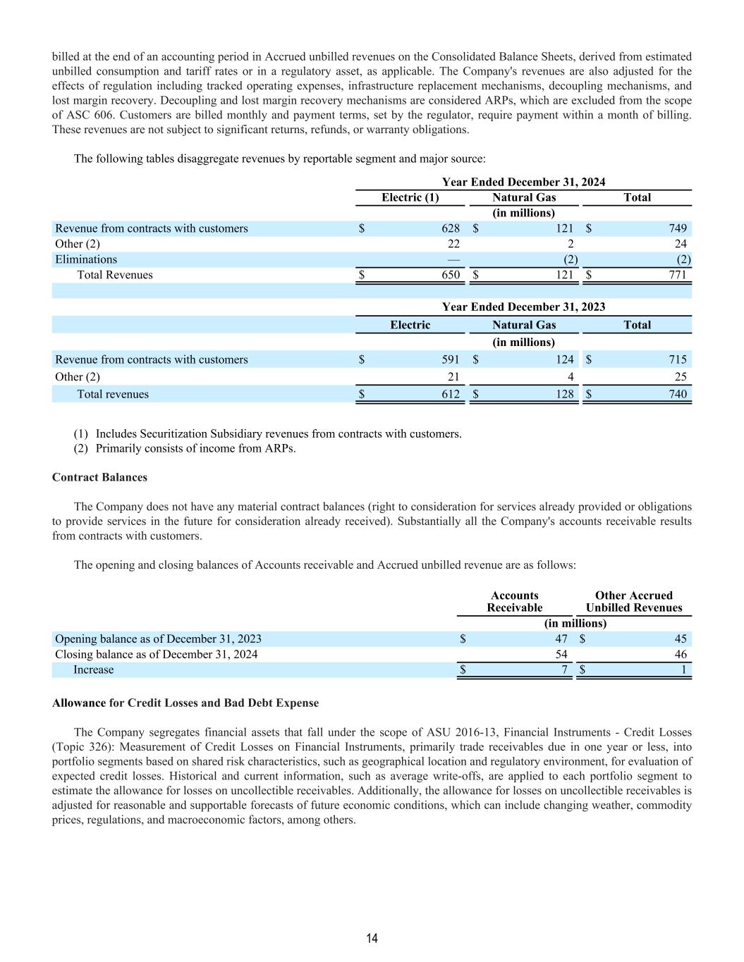 billed at the end of an accounting period in Accrued unbilled revenues on the Consolidated Balance Sheets, derived from estimated unbilled consumption and tariff rates or in a regulatory asset, as applicable. The Company's revenues are also adjusted for the effects of regulation including tracked operating expenses, infrastructure replacement mechanisms, decoupling mechanisms, and lost margin recovery. Decoupling and lost margin recovery mechanisms are considered ARPs, which are excluded from the scope of ASC 606. Customers are billed monthly and payment terms, set by the regulator, require payment within a month of billing. These revenues are not subject to significant returns, refunds, or warranty obligations. The following tables disaggregate revenues by reportable segment and major source: Year Ended December 31, 2024 Electric (1) Natural Gas Total (in millions) Revenue from contracts with customers $ 628 $ 121 $ 749 Other (2) 22 2 24 Eliminations — (2) (2) Total Revenues $ 650 $ 121 $ 771 Year Ended December 31, 2023 Electric Natural Gas Total (in millions) Revenue from contracts with customers $ 591 $ 124 $ 715 Other (2) 21 4 25 Total revenues $ 612 $ 128 $ 740 (1) Includes Securitization Subsidiary revenues from contracts with customers. (2) Primarily consists of income from ARPs. Contract Balances The Company does not have any material contract balances (right to consideration for services already provided or obligations to provide services in the future for consideration already received). Substantially all the Company's accounts receivable results from contracts with customers. The opening and closing balances of Accounts receivable and Accrued unbilled revenue are as follows: Accounts Receivable Other Accrued Unbilled Revenues (in millions) Opening balance as of December 31, 2023 $ 47 $ 45 Closing balance as of December 31, 2024 54 46 Increase $ 7 $ 1 Allowance for Credit Losses and Bad Debt Expense The Company segregates financial assets that fall under the scope of ASU 2016-13, Financial Instruments - Credit Losses (Topic 326): Measurement of Credit Losses on Financial Instruments, primarily trade receivables due in one year or less, into portfolio segments based on shared risk characteristics, such as geographical location and regulatory environment, for evaluation of expected credit losses. Historical and current information, such as average write-offs, are applied to each portfolio segment to estimate the allowance for losses on uncollectible receivables. Additionally, the allowance for losses on uncollectible receivables is adjusted for reasonable and supportable forecasts of future economic conditions, which can include changing weather, commodity prices, regulations, and macroeconomic factors, among others. 14