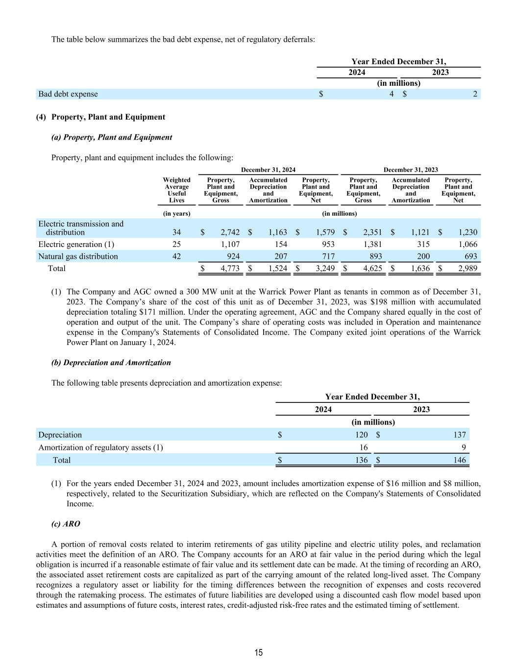 The table below summarizes the bad debt expense, net of regulatory deferrals: Year Ended December 31, 2024 2023 (in millions) Bad debt expense $ 4 $ 2 (4) Property, Plant and Equipment (a) Property, Plant and Equipment Property, plant and equipment includes the following: December 31, 2024 December 31, 2023 Weighted Average Useful Lives Property, Plant and Equipment, Gross Accumulated Depreciation and Amortization Property, Plant and Equipment, Net Property, Plant and Equipment, Gross Accumulated Depreciation and Amortization Property, Plant and Equipment, Net (in years) (in millions) Electric transmission and distribution 34 $ 2,742 $ 1,163 $ 1,579 $ 2,351 $ 1,121 $ 1,230 Electric generation (1) 25 1,107 154 953 1,381 315 1,066 Natural gas distribution 42 924 207 717 893 200 693 Total $ 4,773 $ 1,524 $ 3,249 $ 4,625 $ 1,636 $ 2,989 (1) The Company and AGC owned a 300 MW unit at the Warrick Power Plant as tenants in common as of December 31, 2023. The Company’s share of the cost of this unit as of December 31, 2023, was $198 million with accumulated depreciation totaling $171 million. Under the operating agreement, AGC and the Company shared equally in the cost of operation and output of the unit. The Company’s share of operating costs was included in Operation and maintenance expense in the Company's Statements of Consolidated Income. The Company exited joint operations of the Warrick Power Plant on January 1, 2024. (b) Depreciation and Amortization The following table presents depreciation and amortization expense: Year Ended December 31, 2024 2023 (in millions) Depreciation $ 120 $ 137 Amortization of regulatory assets (1) 16 9 Total $ 136 $ 146 (1) For the years ended December 31, 2024 and 2023, amount includes amortization expense of $16 million and $8 million, respectively, related to the Securitization Subsidiary, which are reflected on the Company's Statements of Consolidated Income. (c) ARO A portion of removal costs related to interim retirements of gas utility pipeline and electric utility poles, and reclamation activities meet the definition of an ARO. The Company accounts for an ARO at fair value in the period during which the legal obligation is incurred if a reasonable estimate of fair value and its settlement date can be made. At the timing of recording an ARO, the associated asset retirement costs are capitalized as part of the carrying amount of the related long-lived asset. The Company recognizes a regulatory asset or liability for the timing differences between the recognition of expenses and costs recovered through the ratemaking process. The estimates of future liabilities are developed using a discounted cash flow model based upon estimates and assumptions of future costs, interest rates, credit-adjusted risk-free rates and the estimated timing of settlement. 15