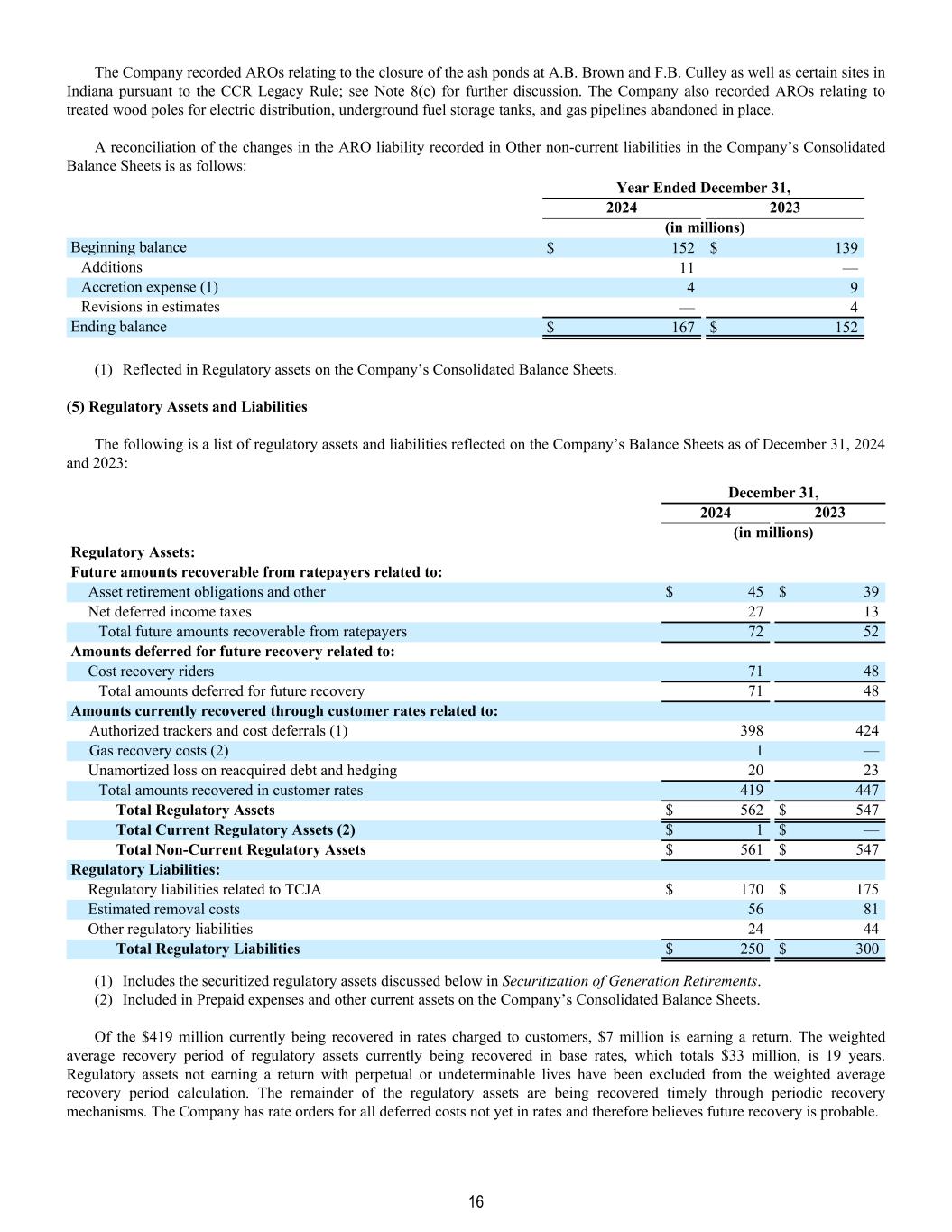 The Company recorded AROs relating to the closure of the ash ponds at A.B. Brown and F.B. Culley as well as certain sites in Indiana pursuant to the CCR Legacy Rule; see Note 8(c) for further discussion. The Company also recorded AROs relating to treated wood poles for electric distribution, underground fuel storage tanks, and gas pipelines abandoned in place. A reconciliation of the changes in the ARO liability recorded in Other non-current liabilities in the Company’s Consolidated Balance Sheets is as follows: Year Ended December 31, 2024 2023 (in millions) Beginning balance $ 152 $ 139 Additions 11 — Accretion expense (1) 4 9 Revisions in estimates — 4 Ending balance $ 167 $ 152 (1) Reflected in Regulatory assets on the Company’s Consolidated Balance Sheets. (5) Regulatory Assets and Liabilities The following is a list of regulatory assets and liabilities reflected on the Company’s Balance Sheets as of December 31, 2024 and 2023: December 31, 2024 2023 (in millions) Regulatory Assets: Future amounts recoverable from ratepayers related to: Asset retirement obligations and other $ 45 $ 39 Net deferred income taxes 27 13 Total future amounts recoverable from ratepayers 72 52 Amounts deferred for future recovery related to: Cost recovery riders 71 48 Total amounts deferred for future recovery 71 48 Amounts currently recovered through customer rates related to: Authorized trackers and cost deferrals (1) 398 424 Gas recovery costs (2) 1 — Unamortized loss on reacquired debt and hedging 20 23 Total amounts recovered in customer rates 419 447 Total Regulatory Assets $ 562 $ 547 Total Current Regulatory Assets (2) $ 1 $ — Total Non-Current Regulatory Assets $ 561 $ 547 Regulatory Liabilities: Regulatory liabilities related to TCJA $ 170 $ 175 Estimated removal costs 56 81 Other regulatory liabilities 24 44 Total Regulatory Liabilities $ 250 $ 300 (1) Includes the securitized regulatory assets discussed below in Securitization of Generation Retirements. (2) Included in Prepaid expenses and other current assets on the Company’s Consolidated Balance Sheets. Of the $419 million currently being recovered in rates charged to customers, $7 million is earning a return. The weighted average recovery period of regulatory assets currently being recovered in base rates, which totals $33 million, is 19 years. Regulatory assets not earning a return with perpetual or undeterminable lives have been excluded from the weighted average recovery period calculation. The remainder of the regulatory assets are being recovered timely through periodic recovery mechanisms. The Company has rate orders for all deferred costs not yet in rates and therefore believes future recovery is probable. 16