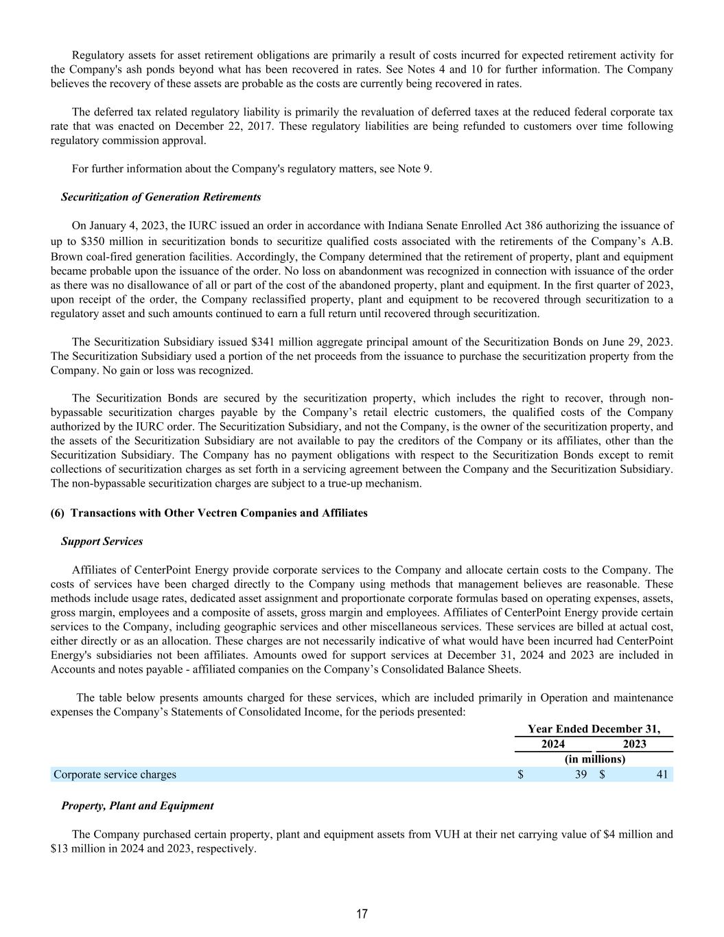 Regulatory assets for asset retirement obligations are primarily a result of costs incurred for expected retirement activity for the Company's ash ponds beyond what has been recovered in rates. See Notes 4 and 10 for further information. The Company believes the recovery of these assets are probable as the costs are currently being recovered in rates. The deferred tax related regulatory liability is primarily the revaluation of deferred taxes at the reduced federal corporate tax rate that was enacted on December 22, 2017. These regulatory liabilities are being refunded to customers over time following regulatory commission approval. For further information about the Company's regulatory matters, see Note 9. Securitization of Generation Retirements On January 4, 2023, the IURC issued an order in accordance with Indiana Senate Enrolled Act 386 authorizing the issuance of up to $350 million in securitization bonds to securitize qualified costs associated with the retirements of the Company’s A.B. Brown coal-fired generation facilities. Accordingly, the Company determined that the retirement of property, plant and equipment became probable upon the issuance of the order. No loss on abandonment was recognized in connection with issuance of the order as there was no disallowance of all or part of the cost of the abandoned property, plant and equipment. In the first quarter of 2023, upon receipt of the order, the Company reclassified property, plant and equipment to be recovered through securitization to a regulatory asset and such amounts continued to earn a full return until recovered through securitization. The Securitization Subsidiary issued $341 million aggregate principal amount of the Securitization Bonds on June 29, 2023. The Securitization Subsidiary used a portion of the net proceeds from the issuance to purchase the securitization property from the Company. No gain or loss was recognized. The Securitization Bonds are secured by the securitization property, which includes the right to recover, through non- bypassable securitization charges payable by the Company’s retail electric customers, the qualified costs of the Company authorized by the IURC order. The Securitization Subsidiary, and not the Company, is the owner of the securitization property, and the assets of the Securitization Subsidiary are not available to pay the creditors of the Company or its affiliates, other than the Securitization Subsidiary. The Company has no payment obligations with respect to the Securitization Bonds except to remit collections of securitization charges as set forth in a servicing agreement between the Company and the Securitization Subsidiary. The non-bypassable securitization charges are subject to a true-up mechanism. (6) Transactions with Other Vectren Companies and Affiliates Support Services Affiliates of CenterPoint Energy provide corporate services to the Company and allocate certain costs to the Company. The costs of services have been charged directly to the Company using methods that management believes are reasonable. These methods include usage rates, dedicated asset assignment and proportionate corporate formulas based on operating expenses, assets, gross margin, employees and a composite of assets, gross margin and employees. Affiliates of CenterPoint Energy provide certain services to the Company, including geographic services and other miscellaneous services. These services are billed at actual cost, either directly or as an allocation. These charges are not necessarily indicative of what would have been incurred had CenterPoint Energy's subsidiaries not been affiliates. Amounts owed for support services at December 31, 2024 and 2023 are included in Accounts and notes payable - affiliated companies on the Company’s Consolidated Balance Sheets. The table below presents amounts charged for these services, which are included primarily in Operation and maintenance expenses the Company’s Statements of Consolidated Income, for the periods presented: Year Ended December 31, 2024 2023 (in millions) Corporate service charges $ 39 $ 41 Property, Plant and Equipment The Company purchased certain property, plant and equipment assets from VUH at their net carrying value of $4 million and $13 million in 2024 and 2023, respectively. 17