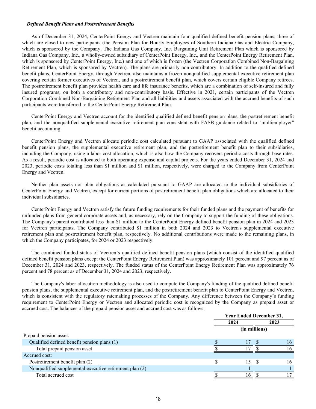 Defined Benefit Plans and Postretirement Benefits As of December 31, 2024, CenterPoint Energy and Vectren maintain four qualified defined benefit pension plans, three of which are closed to new participants (the Pension Plan for Hourly Employees of Southern Indiana Gas and Electric Company, which is sponsored by the Company, The Indiana Gas Company, Inc. Bargaining Unit Retirement Plan which is sponsored by Indiana Gas Company, Inc., a wholly-owned subsidiary of CenterPoint Energy, Inc., and the CenterPoint Energy Retirement Plan, which is sponsored by CenterPoint Energy, Inc.) and one of which is frozen (the Vectren Corporation Combined Non-Bargaining Retirement Plan, which is sponsored by Vectren). The plans are primarily non-contributory. In addition to the qualified defined benefit plans, CenterPoint Energy, through Vectren, also maintains a frozen nonqualified supplemental executive retirement plan covering certain former executives of Vectren, and a postretirement benefit plan, which covers certain eligible Company retirees. The postretirement benefit plan provides health care and life insurance benefits, which are a combination of self-insured and fully insured programs, on both a contributory and non-contributory basis. Effective in 2021, certain participants of the Vectren Corporation Combined Non-Bargaining Retirement Plan and all liabilities and assets associated with the accrued benefits of such participants were transferred to the CenterPoint Energy Retirement Plan. CenterPoint Energy and Vectren account for the identified qualified defined benefit pension plans, the postretirement benefit plan, and the nonqualified supplemental executive retirement plan consistent with FASB guidance related to "multiemployer" benefit accounting. CenterPoint Energy and Vectren allocate periodic cost calculated pursuant to GAAP associated with the qualified defined benefit pension plans, the supplemental executive retirement plan, and the postretirement benefit plan to their subsidiaries, including the Company, using a labor cost allocation, which is also how the Company recovers periodic costs through base rates. As a result, periodic cost is allocated to both operating expense and capital projects. For the years ended December 31, 2024 and 2023, periodic costs totaling less than $1 million and $1 million, respectively, were charged to the Company from CenterPoint Energy and Vectren. Neither plan assets nor plan obligations as calculated pursuant to GAAP are allocated to the individual subsidiaries of CenterPoint Energy and Vectren, except for current portions of postretirement benefit plan obligations which are allocated to their individual subsidiaries. CenterPoint Energy and Vectren satisfy the future funding requirements for their funded plans and the payment of benefits for unfunded plans from general corporate assets and, as necessary, rely on the Company to support the funding of these obligations. The Company's parent contributed less than $1 million to the CenterPoint Energy defined benefit pension plan in 2024 and 2023 for Vectren participants. The Company contributed $1 million in both 2024 and 2023 to Vectren's supplemental executive retirement plan and postretirement benefit plan, respectively. No additional contributions were made to the remaining plans, in which the Company participates, for 2024 or 2023 respectively. The combined funded status of Vectren’s qualified defined benefit pension plans (which consist of the identified qualified defined benefit pension plans except the CenterPoint Energy Retirement Plan) was approximately 101 percent and 97 percent as of December 31, 2024 and 2023, respectively. The funded status of the CenterPoint Energy Retirement Plan was approximately 76 percent and 78 percent as of December 31, 2024 and 2023, respectively. The Company's labor allocation methodology is also used to compute the Company's funding of the qualified defined benefit pension plans, the supplemental executive retirement plan, and the postretirement benefit plan to CenterPoint Energy and Vectren, which is consistent with the regulatory ratemaking processes of the Company. Any difference between the Company’s funding requirement to CenterPoint Energy or Vectren and allocated periodic cost is recognized by the Company as prepaid asset or accrued cost. The balances of the prepaid pension asset and accrued cost was as follows: Year Ended December 31, 2024 2023 (in millions) Prepaid pension asset: Qualified defined benefit pension plans (1) $ 17 $ 16 Total prepaid pension asset $ 17 $ 16 Accrued cost: Postretirement benefit plan (2) $ 15 $ 16 Nonqualified supplemental executive retirement plan (2) 1 1 Total accrued cost $ 16 $ 17 18