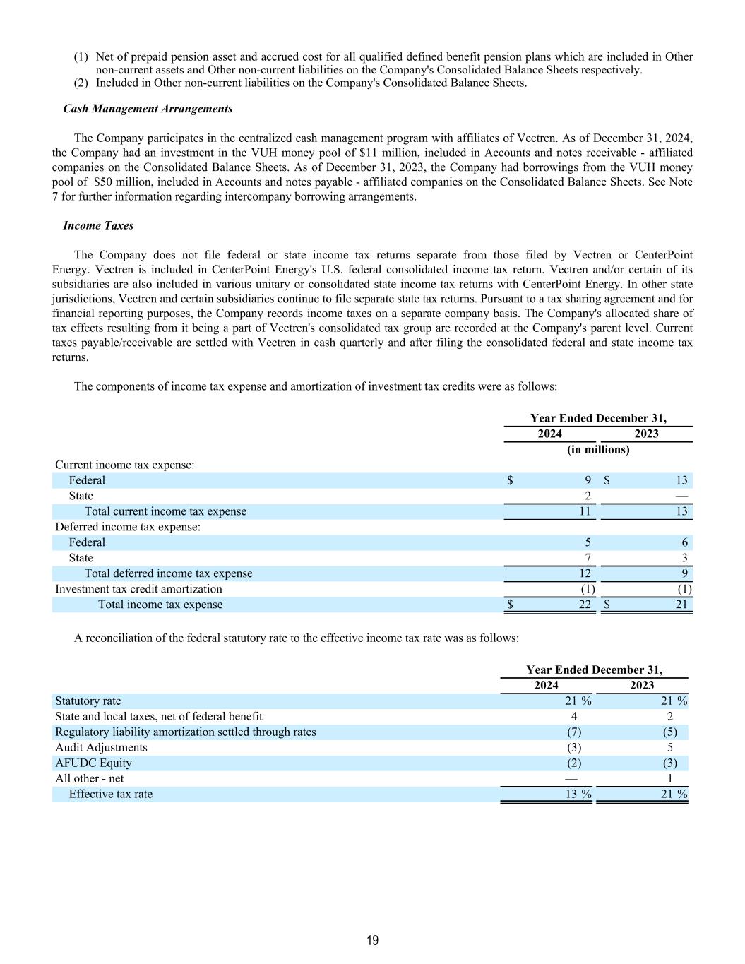 (1) Net of prepaid pension asset and accrued cost for all qualified defined benefit pension plans which are included in Other non-current assets and Other non-current liabilities on the Company's Consolidated Balance Sheets respectively. (2) Included in Other non-current liabilities on the Company's Consolidated Balance Sheets. Cash Management Arrangements The Company participates in the centralized cash management program with affiliates of Vectren. As of December 31, 2024, the Company had an investment in the VUH money pool of $11 million, included in Accounts and notes receivable - affiliated companies on the Consolidated Balance Sheets. As of December 31, 2023, the Company had borrowings from the VUH money pool of $50 million, included in Accounts and notes payable - affiliated companies on the Consolidated Balance Sheets. See Note 7 for further information regarding intercompany borrowing arrangements. Income Taxes The Company does not file federal or state income tax returns separate from those filed by Vectren or CenterPoint Energy. Vectren is included in CenterPoint Energy's U.S. federal consolidated income tax return. Vectren and/or certain of its subsidiaries are also included in various unitary or consolidated state income tax returns with CenterPoint Energy. In other state jurisdictions, Vectren and certain subsidiaries continue to file separate state tax returns. Pursuant to a tax sharing agreement and for financial reporting purposes, the Company records income taxes on a separate company basis. The Company's allocated share of tax effects resulting from it being a part of Vectren's consolidated tax group are recorded at the Company's parent level. Current taxes payable/receivable are settled with Vectren in cash quarterly and after filing the consolidated federal and state income tax returns. The components of income tax expense and amortization of investment tax credits were as follows: Year Ended December 31, 2024 2023 (in millions) Current income tax expense: Federal $ 9 $ 13 State 2 — Total current income tax expense 11 13 Deferred income tax expense: Federal 5 6 State 7 3 Total deferred income tax expense 12 9 Investment tax credit amortization (1) (1) Total income tax expense $ 22 $ 21 A reconciliation of the federal statutory rate to the effective income tax rate was as follows: Year Ended December 31, 2024 2023 Statutory rate 21 % 21 % State and local taxes, net of federal benefit 4 2 Regulatory liability amortization settled through rates (7) (5) Audit Adjustments (3) 5 AFUDC Equity (2) (3) All other - net — 1 Effective tax rate 13 % 21 % 19