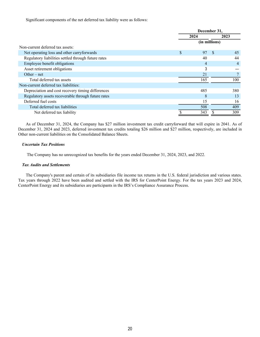 Significant components of the net deferred tax liability were as follows: December 31, 2024 2023 (in millions) Non-current deferred tax assets: Net operating loss and other carryforwards $ 97 $ 45 Regulatory liabilities settled through future rates 40 44 Employee benefit obligations 4 4 Asset retirement obligations 3 — Other – net 21 7 Total deferred tax assets 165 100 Non-current deferred tax liabilities: Depreciation and cost recovery timing differences 485 380 Regulatory assets recoverable through future rates 8 13 Deferred fuel costs 15 16 Total deferred tax liabilities 508 409 Net deferred tax liability $ 343 $ 309 As of December 31, 2024, the Company has $27 million investment tax credit carryforward that will expire in 2041. As of December 31, 2024 and 2023, deferred investment tax credits totaling $26 million and $27 million, respectively, are included in Other non-current liabilities on the Consolidated Balance Sheets. Uncertain Tax Positions The Company has no unrecognized tax benefits for the years ended December 31, 2024, 2023, and 2022. Tax Audits and Settlements The Company's parent and certain of its subsidiaries file income tax returns in the U.S. federal jurisdiction and various states. Tax years through 2022 have been audited and settled with the IRS for CenterPoint Energy. For the tax years 2023 and 2024, CenterPoint Energy and its subsidiaries are participants in the IRS’s Compliance Assurance Process. 20