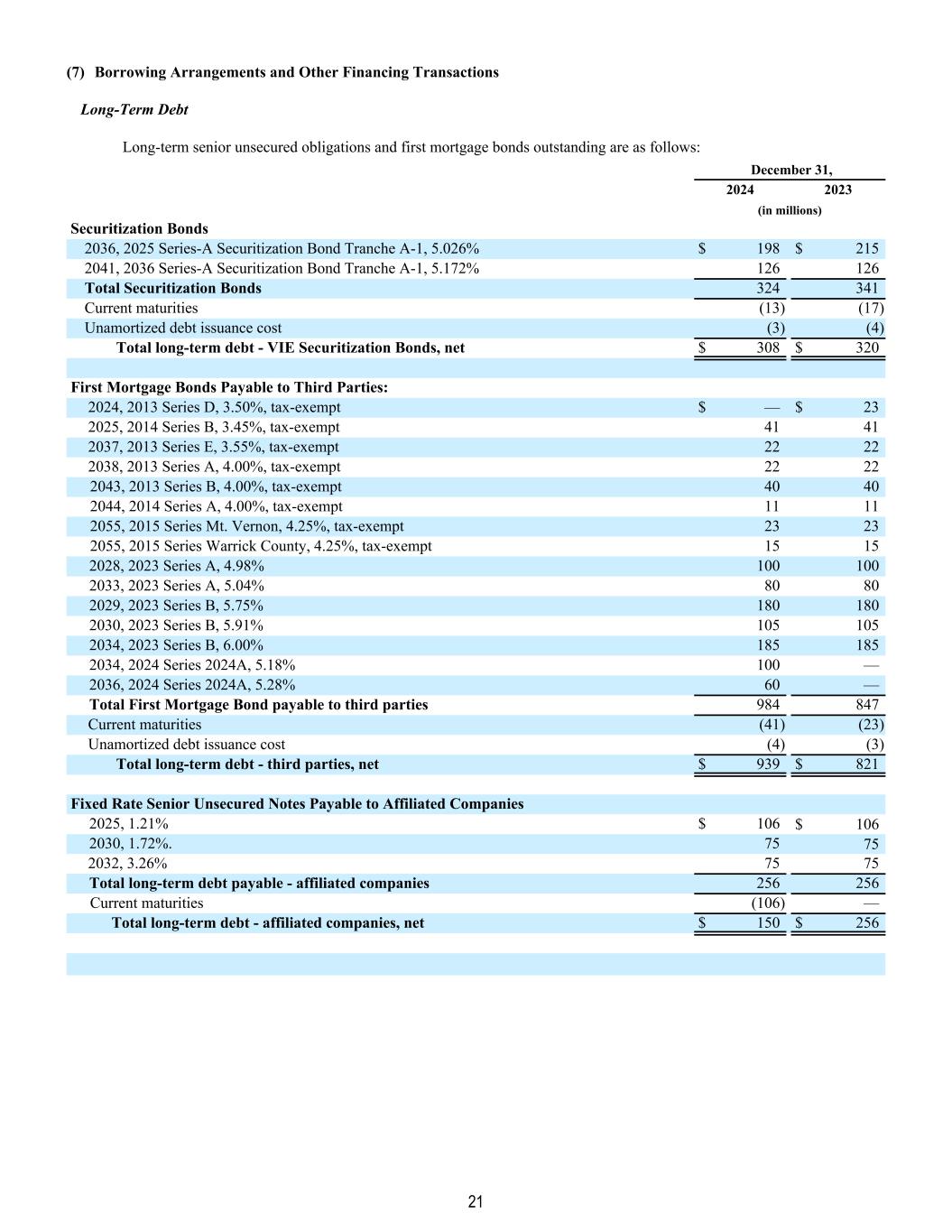 (7) Borrowing Arrangements and Other Financing Transactions Long-Term Debt Long-term senior unsecured obligations and first mortgage bonds outstanding are as follows: Securitization Bonds 2036, 2025 Series-A Securitization Bond Tranche A-1, 5.026% $ 198 $ 215 2041, 2036 Series-A Securitization Bond Tranche A-1, 5.172% 126 126 Total Securitization Bonds 324 341 Current maturities (13) (17) Unamortized debt issuance cost (3) (4) Total long-term debt - VIE Securitization Bonds, net $ 308 $ 320 First Mortgage Bonds Payable to Third Parties: 2024, 2013 Series D, 3.50%, tax-exempt $ — $ 23 2025, 2014 Series B, 3.45%, tax-exempt 41 41 2037, 2013 Series E, 3.55%, tax-exempt 22 22 2038, 2013 Series A, 4.00%, tax-exempt 22 22 2043, 2013 Series B, 4.00%, tax-exempt 40 40 2044, 2014 Series A, 4.00%, tax-exempt 11 11 2055, 2015 Series Mt. Vernon, 4.25%, tax-exempt 23 23 2055, 2015 Series Warrick County, 4.25%, tax-exempt 15 15 2028, 2023 Series A, 4.98% 100 100 2033, 2023 Series A, 5.04% 80 80 2029, 2023 Series B, 5.75% 180 180 2030, 2023 Series B, 5.91% 105 105 2034, 2023 Series B, 6.00% 185 185 2034, 2024 Series 2024A, 5.18% 100 — 2036, 2024 Series 2024A, 5.28% 60 — Total First Mortgage Bond payable to third parties 984 847 Current maturities (41) (23) Unamortized debt issuance cost (4) (3) Total long-term debt - third parties, net $ 939 $ 821 Fixed Rate Senior Unsecured Notes Payable to Affiliated Companies 2025, 1.21% $ 106 $ 106 2030, 1.72%. 75 75 2032, 3.26% 75 75 Total long-term debt payable - affiliated companies 256 256 Current maturities (106) — Total long-term debt - affiliated companies, net $ 150 $ 256 December 31, 2024 2023 (in millions) 21