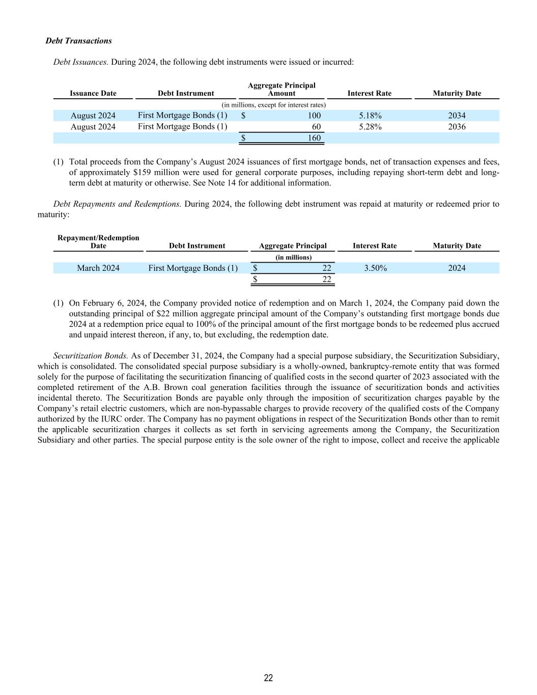 Debt Transactions Debt Issuances. During 2024, the following debt instruments were issued or incurred: Issuance Date Debt Instrument Aggregate Principal Amount Interest Rate Maturity Date (in millions, except for interest rates) August 2024 First Mortgage Bonds (1) $ 100 5.18% 2034 August 2024 First Mortgage Bonds (1) 60 5.28% 2036 $ 160 (1) Total proceeds from the Company’s August 2024 issuances of first mortgage bonds, net of transaction expenses and fees, of approximately $159 million were used for general corporate purposes, including repaying short-term debt and long- term debt at maturity or otherwise. See Note 14 for additional information. Debt Repayments and Redemptions. During 2024, the following debt instrument was repaid at maturity or redeemed prior to maturity: Repayment/Redemption Date Debt Instrument Aggregate Principal Interest Rate Maturity Date (in millions) March 2024 First Mortgage Bonds (1) $ 22 3.50% 2024 $ 22 (1) On February 6, 2024, the Company provided notice of redemption and on March 1, 2024, the Company paid down the outstanding principal of $22 million aggregate principal amount of the Company’s outstanding first mortgage bonds due 2024 at a redemption price equal to 100% of the principal amount of the first mortgage bonds to be redeemed plus accrued and unpaid interest thereon, if any, to, but excluding, the redemption date. Securitization Bonds. As of December 31, 2024, the Company had a special purpose subsidiary, the Securitization Subsidiary, which is consolidated. The consolidated special purpose subsidiary is a wholly-owned, bankruptcy-remote entity that was formed solely for the purpose of facilitating the securitization financing of qualified costs in the second quarter of 2023 associated with the completed retirement of the A.B. Brown coal generation facilities through the issuance of securitization bonds and activities incidental thereto. The Securitization Bonds are payable only through the imposition of securitization charges payable by the Company’s retail electric customers, which are non-bypassable charges to provide recovery of the qualified costs of the Company authorized by the IURC order. The Company has no payment obligations in respect of the Securitization Bonds other than to remit the applicable securitization charges it collects as set forth in servicing agreements among the Company, the Securitization Subsidiary and other parties. The special purpose entity is the sole owner of the right to impose, collect and receive the applicable 22