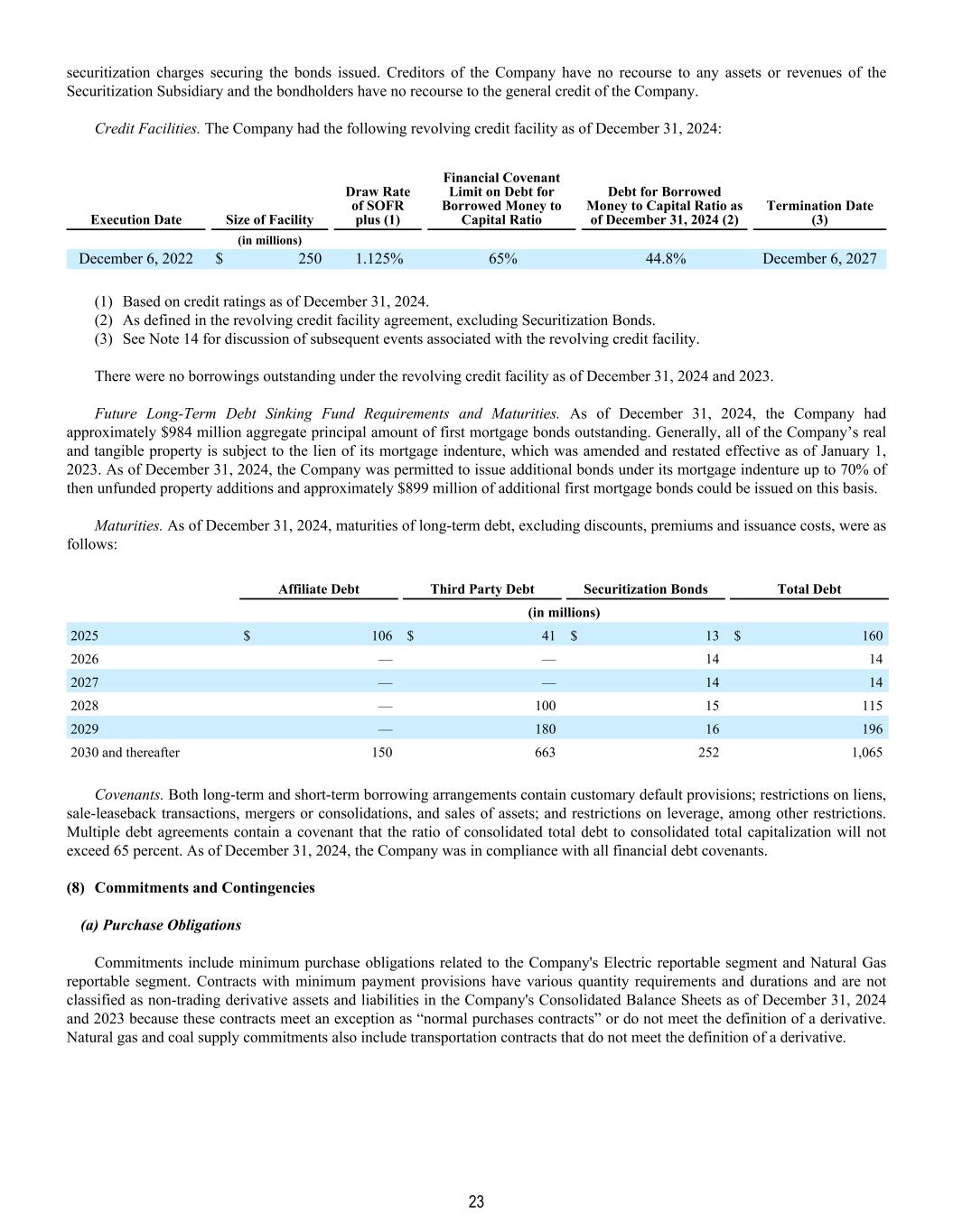 securitization charges securing the bonds issued. Creditors of the Company have no recourse to any assets or revenues of the Securitization Subsidiary and the bondholders have no recourse to the general credit of the Company. Credit Facilities. The Company had the following revolving credit facility as of December 31, 2024: Execution Date Size of Facility Draw Rate of SOFR plus (1) Financial Covenant Limit on Debt for Borrowed Money to Capital Ratio Debt for Borrowed Money to Capital Ratio as of December 31, 2024 (2) Termination Date (3) (in millions) December 6, 2022 $ 250 1.125% 65% 44.8% December 6, 2027 (1) Based on credit ratings as of December 31, 2024. (2) As defined in the revolving credit facility agreement, excluding Securitization Bonds. (3) See Note 14 for discussion of subsequent events associated with the revolving credit facility. There were no borrowings outstanding under the revolving credit facility as of December 31, 2024 and 2023. Future Long-Term Debt Sinking Fund Requirements and Maturities. As of December 31, 2024, the Company had approximately $984 million aggregate principal amount of first mortgage bonds outstanding. Generally, all of the Company’s real and tangible property is subject to the lien of its mortgage indenture, which was amended and restated effective as of January 1, 2023. As of December 31, 2024, the Company was permitted to issue additional bonds under its mortgage indenture up to 70% of then unfunded property additions and approximately $899 million of additional first mortgage bonds could be issued on this basis. Maturities. As of December 31, 2024, maturities of long-term debt, excluding discounts, premiums and issuance costs, were as follows: Affiliate Debt Third Party Debt Securitization Bonds Total Debt (in millions) 2025 $ 106 $ 41 $ 13 $ 160 2026 — — 14 14 2027 — — 14 14 2028 — 100 15 115 2029 — 180 16 196 2030 and thereafter 150 663 252 1,065 Covenants. Both long-term and short-term borrowing arrangements contain customary default provisions; restrictions on liens, sale-leaseback transactions, mergers or consolidations, and sales of assets; and restrictions on leverage, among other restrictions. Multiple debt agreements contain a covenant that the ratio of consolidated total debt to consolidated total capitalization will not exceed 65 percent. As of December 31, 2024, the Company was in compliance with all financial debt covenants. (8) Commitments and Contingencies (a) Purchase Obligations Commitments include minimum purchase obligations related to the Company's Electric reportable segment and Natural Gas reportable segment. Contracts with minimum payment provisions have various quantity requirements and durations and are not classified as non-trading derivative assets and liabilities in the Company's Consolidated Balance Sheets as of December 31, 2024 and 2023 because these contracts meet an exception as “normal purchases contracts” or do not meet the definition of a derivative. Natural gas and coal supply commitments also include transportation contracts that do not meet the definition of a derivative. 23