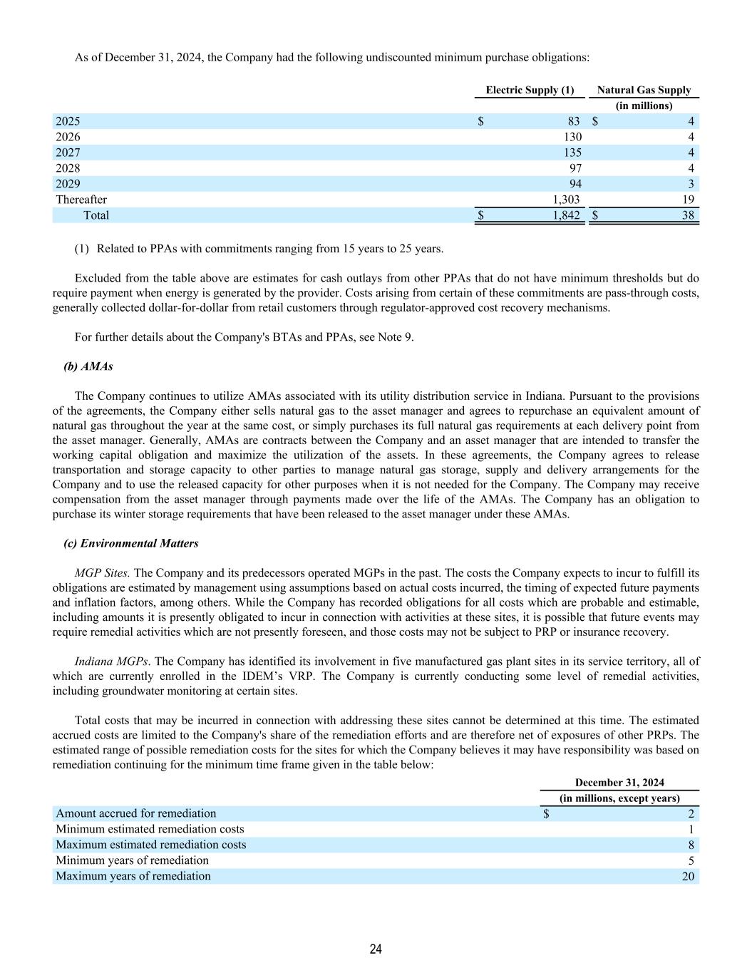 As of December 31, 2024, the Company had the following undiscounted minimum purchase obligations: Electric Supply (1) Natural Gas Supply (in millions) 2025 $ 83 $ 4 2026 130 4 2027 135 4 2028 97 4 2029 94 3 Thereafter 1,303 19 Total $ 1,842 $ 38 (1) Related to PPAs with commitments ranging from 15 years to 25 years. Excluded from the table above are estimates for cash outlays from other PPAs that do not have minimum thresholds but do require payment when energy is generated by the provider. Costs arising from certain of these commitments are pass-through costs, generally collected dollar-for-dollar from retail customers through regulator-approved cost recovery mechanisms. For further details about the Company's BTAs and PPAs, see Note 9. (b) AMAs The Company continues to utilize AMAs associated with its utility distribution service in Indiana. Pursuant to the provisions of the agreements, the Company either sells natural gas to the asset manager and agrees to repurchase an equivalent amount of natural gas throughout the year at the same cost, or simply purchases its full natural gas requirements at each delivery point from the asset manager. Generally, AMAs are contracts between the Company and an asset manager that are intended to transfer the working capital obligation and maximize the utilization of the assets. In these agreements, the Company agrees to release transportation and storage capacity to other parties to manage natural gas storage, supply and delivery arrangements for the Company and to use the released capacity for other purposes when it is not needed for the Company. The Company may receive compensation from the asset manager through payments made over the life of the AMAs. The Company has an obligation to purchase its winter storage requirements that have been released to the asset manager under these AMAs. (c) Environmental Matters MGP Sites. The Company and its predecessors operated MGPs in the past. The costs the Company expects to incur to fulfill its obligations are estimated by management using assumptions based on actual costs incurred, the timing of expected future payments and inflation factors, among others. While the Company has recorded obligations for all costs which are probable and estimable, including amounts it is presently obligated to incur in connection with activities at these sites, it is possible that future events may require remedial activities which are not presently foreseen, and those costs may not be subject to PRP or insurance recovery. Indiana MGPs. The Company has identified its involvement in five manufactured gas plant sites in its service territory, all of which are currently enrolled in the IDEM’s VRP. The Company is currently conducting some level of remedial activities, including groundwater monitoring at certain sites. Total costs that may be incurred in connection with addressing these sites cannot be determined at this time. The estimated accrued costs are limited to the Company's share of the remediation efforts and are therefore net of exposures of other PRPs. The estimated range of possible remediation costs for the sites for which the Company believes it may have responsibility was based on remediation continuing for the minimum time frame given in the table below: December 31, 2024 (in millions, except years) Amount accrued for remediation $ 2 Minimum estimated remediation costs 1 Maximum estimated remediation costs 8 Minimum years of remediation 5 Maximum years of remediation 20 24