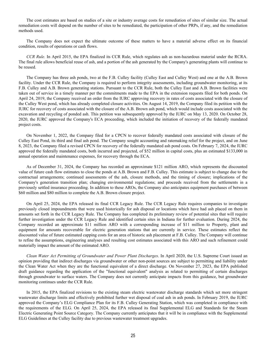 The cost estimates are based on studies of a site or industry average costs for remediation of sites of similar size. The actual remediation costs will depend on the number of sites to be remediated, the participation of other PRPs, if any, and the remediation methods used. The Company does not expect the ultimate outcome of these matters to have a material adverse effect on its financial condition, results of operations or cash flows. CCR Rule. In April 2015, the EPA finalized its CCR Rule, which regulates ash as non-hazardous material under the RCRA. The final rule allows beneficial reuse of ash, and a portion of the ash generated by the Company's generating plants will continue to be reused. The Company has three ash ponds, two at the F.B. Culley facility (Culley East and Culley West) and one at the A.B. Brown facility. Under the CCR Rule, the Company is required to perform integrity assessments, including groundwater monitoring, at its F.B. Culley and A.B. Brown generating stations. Pursuant to the CCR Rule, both the Culley East and A.B. Brown facilities were taken out of service in a timely manner per the commitments made to the EPA in the extension requests filed for both ponds. On April 24, 2019, the Company received an order from the IURC approving recovery in rates of costs associated with the closure of the Culley West pond, which has already completed closure activities. On August 14, 2019, the Company filed its petition with the IURC for recovery of costs associated with the closure of the A.B. Brown ash pond, which would include costs associated with the excavation and recycling of ponded ash. This petition was subsequently approved by the IURC on May 13, 2020. On October 28, 2020, the IURC approved the Company's ECA proceeding, which included the initiation of recovery of the federally mandated project costs. On November 1, 2022, the Company filed for a CPCN to recover federally mandated costs associated with closure of the Culley East Pond, its third and final ash pond. The Company sought accounting and ratemaking relief for the project, and on June 8, 2023, the Company filed a revised CPCN for recovery of the federally mandated ash pond costs. On February 7, 2024, the IURC approved the federally mandated costs, both incurred and projected, of $52 million in capital costs, plus an estimated $133,000 in annual operation and maintenance expenses, for recovery through the ECA. As of December 31, 2024, the Company has recorded an approximate $121 million ARO, which represents the discounted value of future cash flow estimates to close the ponds at A.B. Brown and F.B. Culley. This estimate is subject to change due to the contractual arrangements; continued assessments of the ash, closure methods, and the timing of closure; implications of the Company's generation transition plan; changing environmental regulations; and proceeds received from the settlements in a previously settled insurance proceeding. In addition to these AROs, the Company also anticipates equipment purchases of between $60 million and $80 million to complete the A.B. Brown closure project. On April 25, 2024, the EPA released its final CCR Legacy Rule. The CCR Legacy Rule requires companies to investigate previously closed impoundments that were used historically for ash disposal or locations which have had ash placed on them in amounts set forth in the CCR Legacy Rule. The Company has completed its preliminary review of potential sites that will require further investigation under the CCR Legacy Rule and identified certain sites in Indiana for further evaluation. During 2024, the Company recorded an approximate $11 million ARO with a corresponding increase of $11 million to Property, plant and equipment for amounts recoverable for electric generation stations that are currently in service. These estimates reflect the discounted value of future estimated capping costs for an area of historic ash placement at F.B. Culley. The Company will continue to refine the assumptions, engineering analyses and resulting cost estimates associated with this ARO and such refinement could materially impact the amount of the estimated ARO. Clean Water Act Permitting of Groundwater and Power Plant Discharges. In April 2020, the U.S. Supreme Court issued an opinion providing that indirect discharges via groundwater or other non-point sources are subject to permitting and liability under the Clean Water Act when they are the functional equivalent of a direct discharge. On November 27, 2023, the EPA published draft guidance regarding the application of the "functional equivalent" analysis as related to permitting of certain discharges through groundwater to surface waters. The Company does not currently anticipate impacts from this guidance, but groundwater monitoring continues under the CCR Rule. In 2015, the EPA finalized revisions to the existing steam electric wastewater discharge standards which set more stringent wastewater discharge limits and effectively prohibited further wet disposal of coal ash in ash ponds. In February 2019, the IURC approved the Company’s ELG Compliance Plan for its F.B. Culley Generating Station, which was completed in compliance with the requirements of the ELG. On April 25, 2024, the EPA released its final Supplemental ELG and Standards for the Steam Electric Generating Point Source Category. The Company currently anticipates that it will be in compliance with the Supplemental ELG Guidelines at the Culley facility due to previous wastewater treatment upgrades. 25