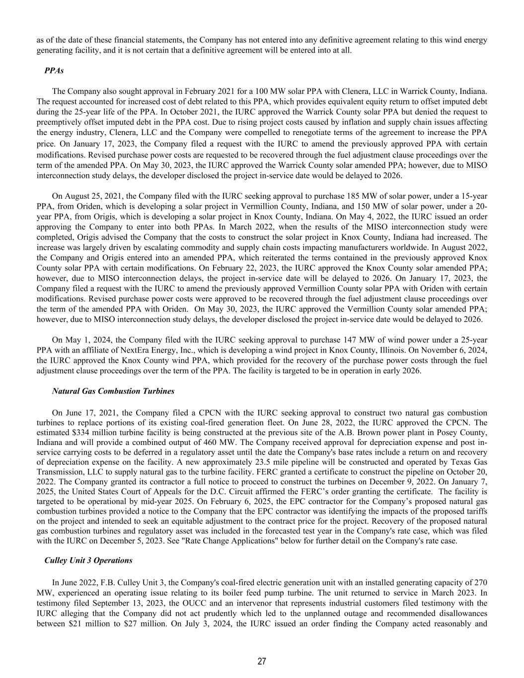 as of the date of these financial statements, the Company has not entered into any definitive agreement relating to this wind energy generating facility, and it is not certain that a definitive agreement will be entered into at all. PPAs The Company also sought approval in February 2021 for a 100 MW solar PPA with Clenera, LLC in Warrick County, Indiana. The request accounted for increased cost of debt related to this PPA, which provides equivalent equity return to offset imputed debt during the 25-year life of the PPA. In October 2021, the IURC approved the Warrick County solar PPA but denied the request to preemptively offset imputed debt in the PPA cost. Due to rising project costs caused by inflation and supply chain issues affecting the energy industry, Clenera, LLC and the Company were compelled to renegotiate terms of the agreement to increase the PPA price. On January 17, 2023, the Company filed a request with the IURC to amend the previously approved PPA with certain modifications. Revised purchase power costs are requested to be recovered through the fuel adjustment clause proceedings over the term of the amended PPA. On May 30, 2023, the IURC approved the Warrick County solar amended PPA; however, due to MISO interconnection study delays, the developer disclosed the project in-service date would be delayed to 2026. On August 25, 2021, the Company filed with the IURC seeking approval to purchase 185 MW of solar power, under a 15-year PPA, from Oriden, which is developing a solar project in Vermillion County, Indiana, and 150 MW of solar power, under a 20- year PPA, from Origis, which is developing a solar project in Knox County, Indiana. On May 4, 2022, the IURC issued an order approving the Company to enter into both PPAs. In March 2022, when the results of the MISO interconnection study were completed, Origis advised the Company that the costs to construct the solar project in Knox County, Indiana had increased. The increase was largely driven by escalating commodity and supply chain costs impacting manufacturers worldwide. In August 2022, the Company and Origis entered into an amended PPA, which reiterated the terms contained in the previously approved Knox County solar PPA with certain modifications. On February 22, 2023, the IURC approved the Knox County solar amended PPA; however, due to MISO interconnection delays, the project in-service date will be delayed to 2026. On January 17, 2023, the Company filed a request with the IURC to amend the previously approved Vermillion County solar PPA with Oriden with certain modifications. Revised purchase power costs were approved to be recovered through the fuel adjustment clause proceedings over the term of the amended PPA with Oriden. On May 30, 2023, the IURC approved the Vermillion County solar amended PPA; however, due to MISO interconnection study delays, the developer disclosed the project in-service date would be delayed to 2026. On May 1, 2024, the Company filed with the IURC seeking approval to purchase 147 MW of wind power under a 25-year PPA with an affiliate of NextEra Energy, Inc., which is developing a wind project in Knox County, Illinois. On November 6, 2024, the IURC approved the Knox County wind PPA, which provided for the recovery of the purchase power costs through the fuel adjustment clause proceedings over the term of the PPA. The facility is targeted to be in operation in early 2026. Natural Gas Combustion Turbines On June 17, 2021, the Company filed a CPCN with the IURC seeking approval to construct two natural gas combustion turbines to replace portions of its existing coal-fired generation fleet. On June 28, 2022, the IURC approved the CPCN. The estimated $334 million turbine facility is being constructed at the previous site of the A.B. Brown power plant in Posey County, Indiana and will provide a combined output of 460 MW. The Company received approval for depreciation expense and post in- service carrying costs to be deferred in a regulatory asset until the date the Company's base rates include a return on and recovery of depreciation expense on the facility. A new approximately 23.5 mile pipeline will be constructed and operated by Texas Gas Transmission, LLC to supply natural gas to the turbine facility. FERC granted a certificate to construct the pipeline on October 20, 2022. The Company granted its contractor a full notice to proceed to construct the turbines on December 9, 2022. On January 7, 2025, the United States Court of Appeals for the D.C. Circuit affirmed the FERC’s order granting the certificate. The facility is targeted to be operational by mid-year 2025. On February 6, 2025, the EPC contractor for the Company’s proposed natural gas combustion turbines provided a notice to the Company that the EPC contractor was identifying the impacts of the proposed tariffs on the project and intended to seek an equitable adjustment to the contract price for the project. Recovery of the proposed natural gas combustion turbines and regulatory asset was included in the forecasted test year in the Company's rate case, which was filed with the IURC on December 5, 2023. See "Rate Change Applications" below for further detail on the Company's rate case. Culley Unit 3 Operations In June 2022, F.B. Culley Unit 3, the Company's coal-fired electric generation unit with an installed generating capacity of 270 MW, experienced an operating issue relating to its boiler feed pump turbine. The unit returned to service in March 2023. In testimony filed September 13, 2023, the OUCC and an intervenor that represents industrial customers filed testimony with the IURC alleging that the Company did not act prudently which led to the unplanned outage and recommended disallowances between $21 million to $27 million. On July 3, 2024, the IURC issued an order finding the Company acted reasonably and 27