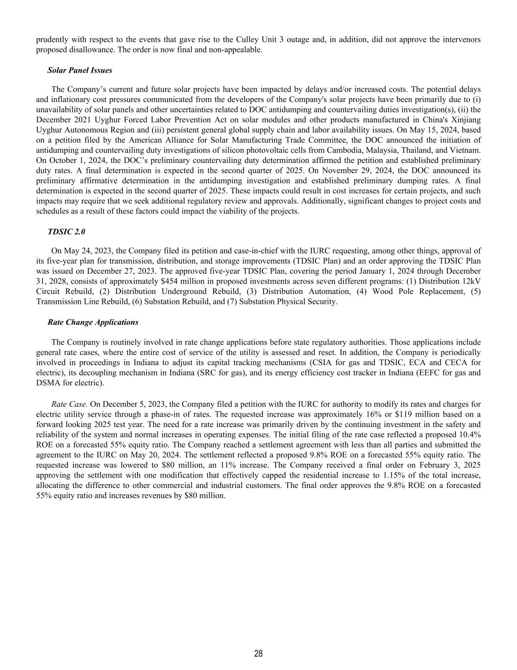 prudently with respect to the events that gave rise to the Culley Unit 3 outage and, in addition, did not approve the intervenors proposed disallowance. The order is now final and non-appealable. Solar Panel Issues The Company’s current and future solar projects have been impacted by delays and/or increased costs. The potential delays and inflationary cost pressures communicated from the developers of the Company's solar projects have been primarily due to (i) unavailability of solar panels and other uncertainties related to DOC antidumping and countervailing duties investigation(s), (ii) the December 2021 Uyghur Forced Labor Prevention Act on solar modules and other products manufactured in China's Xinjiang Uyghur Autonomous Region and (iii) persistent general global supply chain and labor availability issues. On May 15, 2024, based on a petition filed by the American Alliance for Solar Manufacturing Trade Committee, the DOC announced the initiation of antidumping and countervailing duty investigations of silicon photovoltaic cells from Cambodia, Malaysia, Thailand, and Vietnam. On October 1, 2024, the DOC’s preliminary countervailing duty determination affirmed the petition and established preliminary duty rates. A final determination is expected in the second quarter of 2025. On November 29, 2024, the DOC announced its preliminary affirmative determination in the antidumping investigation and established preliminary dumping rates. A final determination is expected in the second quarter of 2025. These impacts could result in cost increases for certain projects, and such impacts may require that we seek additional regulatory review and approvals. Additionally, significant changes to project costs and schedules as a result of these factors could impact the viability of the projects. TDSIC 2.0 On May 24, 2023, the Company filed its petition and case-in-chief with the IURC requesting, among other things, approval of its five-year plan for transmission, distribution, and storage improvements (TDSIC Plan) and an order approving the TDSIC Plan was issued on December 27, 2023. The approved five-year TDSIC Plan, covering the period January 1, 2024 through December 31, 2028, consists of approximately $454 million in proposed investments across seven different programs: (1) Distribution 12kV Circuit Rebuild, (2) Distribution Underground Rebuild, (3) Distribution Automation, (4) Wood Pole Replacement, (5) Transmission Line Rebuild, (6) Substation Rebuild, and (7) Substation Physical Security. Rate Change Applications The Company is routinely involved in rate change applications before state regulatory authorities. Those applications include general rate cases, where the entire cost of service of the utility is assessed and reset. In addition, the Company is periodically involved in proceedings in Indiana to adjust its capital tracking mechanisms (CSIA for gas and TDSIC, ECA and CECA for electric), its decoupling mechanism in Indiana (SRC for gas), and its energy efficiency cost tracker in Indiana (EEFC for gas and DSMA for electric). Rate Case. On December 5, 2023, the Company filed a petition with the IURC for authority to modify its rates and charges for electric utility service through a phase-in of rates. The requested increase was approximately 16% or $119 million based on a forward looking 2025 test year. The need for a rate increase was primarily driven by the continuing investment in the safety and reliability of the system and normal increases in operating expenses. The initial filing of the rate case reflected a proposed 10.4% ROE on a forecasted 55% equity ratio. The Company reached a settlement agreement with less than all parties and submitted the agreement to the IURC on May 20, 2024. The settlement reflected a proposed 9.8% ROE on a forecasted 55% equity ratio. The requested increase was lowered to $80 million, an 11% increase. The Company received a final order on February 3, 2025 approving the settlement with one modification that effectively capped the residential increase to 1.15% of the total increase, allocating the difference to other commercial and industrial customers. The final order approves the 9.8% ROE on a forecasted 55% equity ratio and increases revenues by $80 million. 28