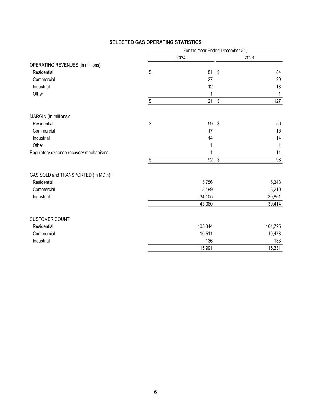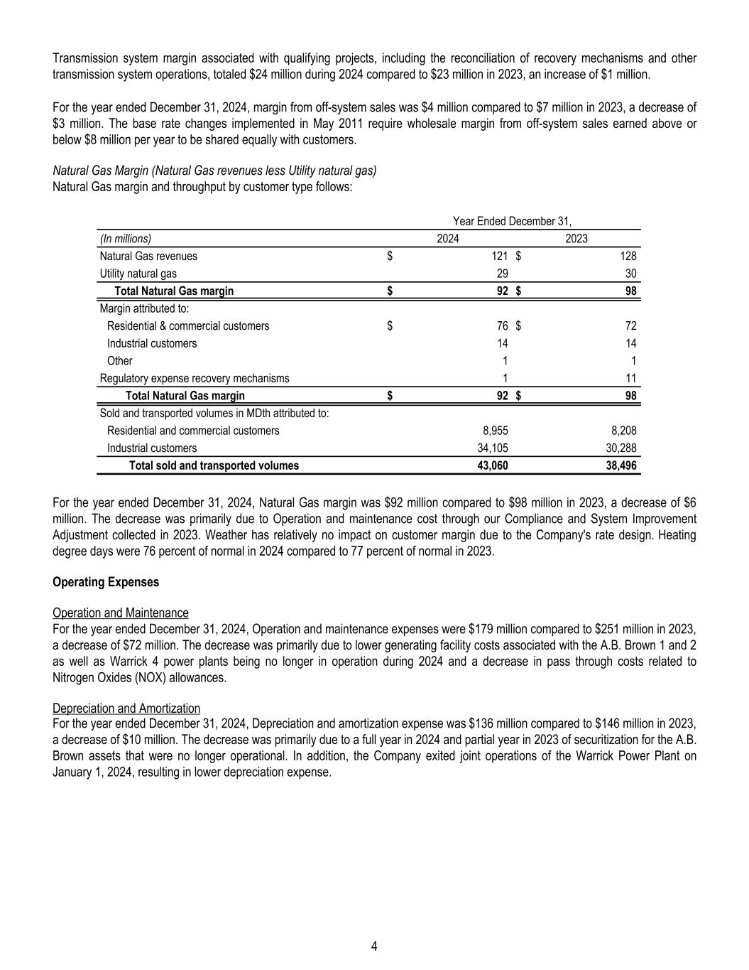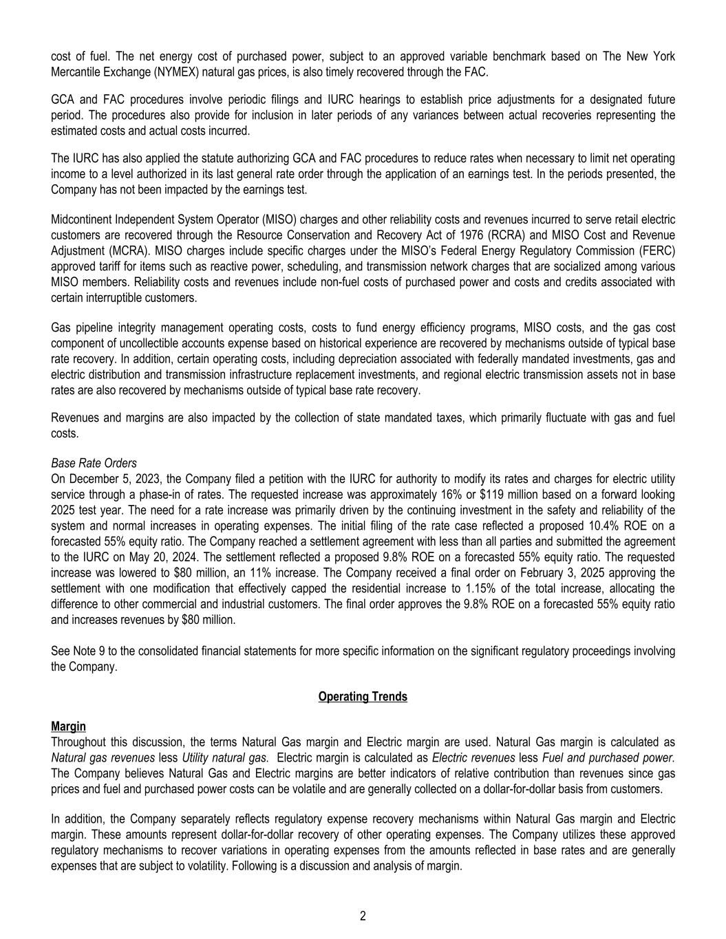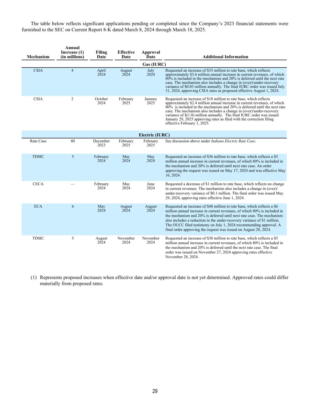 The table below reflects significant applications pending or completed since the Company’s 2023 financial statements were furnished to the SEC on Current Report 8-K dated March 8, 2024 through March 18, 2025. Gas (IURC) CSIA 4 April 2024 August 2024 July 2024 Requested an increase of $35 million to rate base, which reflects approximately $3.6 million annual increase in current revenues, of which 80% is included in the mechanism and 20% is deferred until the next rate case. The mechanism also includes a change in (over)/under-recovery variance of $0.03 million annually. The final IURC order was issued July 31, 2024, approving CSIA rates as proposed effective August 1, 2024. CSIA 2 October 2024 February 2025 January 2025 Requested an increase of $18 million to rate base, which reflects approximately $2.4 million annual increase in current revenues, of which 80% is included in the mechanism and 20% is deferred until the next rate case. The mechanism also includes a change in (over)/under-recovery variance of $(1.0) million annually. The final IURC order was issued January 29, 2025 approving rates as filed with the correction filing effective February 1, 2025. Electric (IURC) Rate Case 80 December 2023 February 2025 February 2025 See discussion above under Indiana Electric Rate Case. TDSIC 5 February 2024 May 2024 May 2024 Requested an increase of $36 million to rate base, which reflects a $5 million annual increase in current revenues, of which 80% is included in the mechanism and 20% is deferred until next rate case. An order approving the request was issued on May 17, 2024 and was effective May 16, 2024. CECA — February 2024 May 2024 June 2024 Requested a decrease of $1 million to rate base, which reflects no change in current revenues. The mechanism also includes a change in (over)/ under-recovery variance of $0.1 million. The final order was issued May 29, 2024, approving rates effective June 1, 2024. ECA 6 May 2024 August 2024 August 2024 Requested an increase of $48 million to rate base, which reflects a $6 million annual increase in current revenues, of which 80% is included in the mechanism and 20% is deferred until next rate case. The mechanism also includes a reduction in the under-recovery variance of $1 million. The OUCC filed testimony on July 1, 2024 recommending approval. A final order approving the request was issued on August 28, 2024. TDSIC 5 August 2024 November 2024 November 2024 Requested an increase of $30 million to rate base, which reflects a $5 million annual increase in current revenues, of which 80% is included in the mechanism and 20% is deferred until the next rate case. The final order was issued on November 27, 2024 approving rates effective November 28, 2024. Mechanism Annual Increase (1) (in millions) Filing Date Effective Date Approval Date Additional Information (1) Represents proposed increases when effective date and/or approval date is not yet determined. Approved rates could differ materially from proposed rates. 29