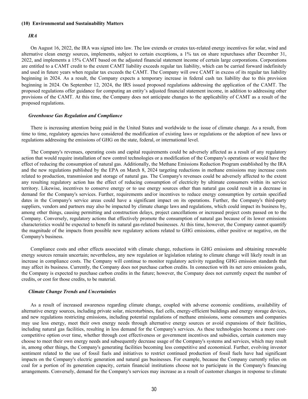 (10) Environmental and Sustainability Matters IRA On August 16, 2022, the IRA was signed into law. The law extends or creates tax-related energy incentives for solar, wind and alternative clean energy sources, implements, subject to certain exceptions, a 1% tax on share repurchases after December 31, 2022, and implements a 15% CAMT based on the adjusted financial statement income of certain large corporations. Corporations are entitled to a CAMT credit to the extent CAMT liability exceeds regular tax liability, which can be carried forward indefinitely and used in future years when regular tax exceeds the CAMT. The Company will owe CAMT in excess of its regular tax liability beginning in 2024. As a result, the Company expects a temporary increase in federal cash tax liability due to this provision beginning in 2024. On September 12, 2024, the IRS issued proposed regulations addressing the application of the CAMT. The proposed regulations offer guidance for computing an entity’s adjusted financial statement income, in addition to addressing other provisions of the CAMT. At this time, the Company does not anticipate changes to the applicability of CAMT as a result of the proposed regulations. Greenhouse Gas Regulation and Compliance There is increasing attention being paid in the United States and worldwide to the issue of climate change. As a result, from time to time, regulatory agencies have considered the modification of existing laws or regulations or the adoption of new laws or regulations addressing the emissions of GHG on the state, federal, or international level. The Company's revenues, operating costs and capital requirements could be adversely affected as a result of any regulatory action that would require installation of new control technologies or a modification of the Company's operations or would have the effect of reducing the consumption of natural gas. Additionally, the Methane Emissions Reduction Program established by the IRA and the new regulations published by the EPA on March 8, 2024 targeting reductions in methane emissions may increase costs related to production, transmission and storage of natural gas. The Company's revenues could be adversely affected to the extent any resulting regulatory action has the effect of reducing consumption of electricity by ultimate consumers within its service territory. Likewise, incentives to conserve energy or to use energy sources other than natural gas could result in a decrease in demand for the Company's services. Further, requirements and/or incentives to reduce energy consumption by certain specified dates in the Company's service areas could have a significant impact on its operations. Further, the Company's third-party suppliers, vendors and partners may also be impacted by climate change laws and regulations, which could impact its business by, among other things, causing permitting and construction delays, project cancellations or increased project costs passed on to the Company. Conversely, regulatory actions that effectively promote the consumption of natural gas because of its lower emissions characteristics would be expected to benefit its natural gas-related businesses. At this time, however, the Company cannot quantify the magnitude of the impacts from possible new regulatory actions related to GHG emissions, either positive or negative, on the Company's business. Compliance costs and other effects associated with climate change, reductions in GHG emissions and obtaining renewable energy sources remain uncertain; nevertheless, any new regulation or legislation relating to climate change will likely result in an increase in compliance costs. The Company will continue to monitor regulatory activity regarding GHG emission standards that may affect its business. Currently, the Company does not purchase carbon credits. In connection with its net zero emissions goals, the Company is expected to purchase carbon credits in the future; however, the Company does not currently expect the number of credits, or cost for those credits, to be material. Climate Change Trends and Uncertainties As a result of increased awareness regarding climate change, coupled with adverse economic conditions, availability of alternative energy sources, including private solar, microturbines, fuel cells, energy-efficient buildings and energy storage devices, and new regulations restricting emissions, including potential regulations of methane emissions, some consumers and companies may use less energy, meet their own energy needs through alternative energy sources or avoid expansions of their facilities, including natural gas facilities, resulting in less demand for the Company's services. As these technologies become a more cost- competitive option over time, whether through cost effectiveness or government incentives and subsidies, certain customers may choose to meet their own energy needs and subsequently decrease usage of the Company's systems and services, which may result in, among other things, the Company's generating facilities becoming less competitive and economical. Further, evolving investor sentiment related to the use of fossil fuels and initiatives to restrict continued production of fossil fuels have had significant impacts on the Company's electric generation and natural gas businesses. For example, because the Company currently relies on coal for a portion of its generation capacity, certain financial institutions choose not to participate in the Company's financing arrangements. Conversely, demand for the Company's services may increase as a result of customer changes in response to climate 30