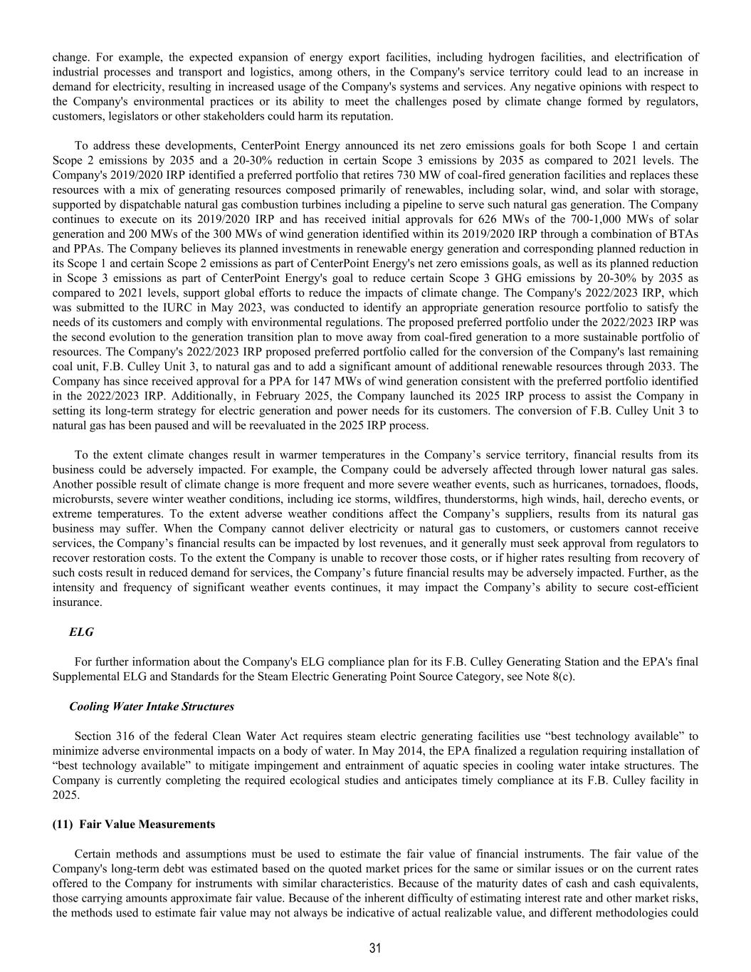 change. For example, the expected expansion of energy export facilities, including hydrogen facilities, and electrification of industrial processes and transport and logistics, among others, in the Company's service territory could lead to an increase in demand for electricity, resulting in increased usage of the Company's systems and services. Any negative opinions with respect to the Company's environmental practices or its ability to meet the challenges posed by climate change formed by regulators, customers, legislators or other stakeholders could harm its reputation. To address these developments, CenterPoint Energy announced its net zero emissions goals for both Scope 1 and certain Scope 2 emissions by 2035 and a 20-30% reduction in certain Scope 3 emissions by 2035 as compared to 2021 levels. The Company's 2019/2020 IRP identified a preferred portfolio that retires 730 MW of coal-fired generation facilities and replaces these resources with a mix of generating resources composed primarily of renewables, including solar, wind, and solar with storage, supported by dispatchable natural gas combustion turbines including a pipeline to serve such natural gas generation. The Company continues to execute on its 2019/2020 IRP and has received initial approvals for 626 MWs of the 700-1,000 MWs of solar generation and 200 MWs of the 300 MWs of wind generation identified within its 2019/2020 IRP through a combination of BTAs and PPAs. The Company believes its planned investments in renewable energy generation and corresponding planned reduction in its Scope 1 and certain Scope 2 emissions as part of CenterPoint Energy's net zero emissions goals, as well as its planned reduction in Scope 3 emissions as part of CenterPoint Energy's goal to reduce certain Scope 3 GHG emissions by 20-30% by 2035 as compared to 2021 levels, support global efforts to reduce the impacts of climate change. The Company's 2022/2023 IRP, which was submitted to the IURC in May 2023, was conducted to identify an appropriate generation resource portfolio to satisfy the needs of its customers and comply with environmental regulations. The proposed preferred portfolio under the 2022/2023 IRP was the second evolution to the generation transition plan to move away from coal-fired generation to a more sustainable portfolio of resources. The Company's 2022/2023 IRP proposed preferred portfolio called for the conversion of the Company's last remaining coal unit, F.B. Culley Unit 3, to natural gas and to add a significant amount of additional renewable resources through 2033. The Company has since received approval for a PPA for 147 MWs of wind generation consistent with the preferred portfolio identified in the 2022/2023 IRP. Additionally, in February 2025, the Company launched its 2025 IRP process to assist the Company in setting its long-term strategy for electric generation and power needs for its customers. The conversion of F.B. Culley Unit 3 to natural gas has been paused and will be reevaluated in the 2025 IRP process. To the extent climate changes result in warmer temperatures in the Company’s service territory, financial results from its business could be adversely impacted. For example, the Company could be adversely affected through lower natural gas sales. Another possible result of climate change is more frequent and more severe weather events, such as hurricanes, tornadoes, floods, microbursts, severe winter weather conditions, including ice storms, wildfires, thunderstorms, high winds, hail, derecho events, or extreme temperatures. To the extent adverse weather conditions affect the Company’s suppliers, results from its natural gas business may suffer. When the Company cannot deliver electricity or natural gas to customers, or customers cannot receive services, the Company’s financial results can be impacted by lost revenues, and it generally must seek approval from regulators to recover restoration costs. To the extent the Company is unable to recover those costs, or if higher rates resulting from recovery of such costs result in reduced demand for services, the Company’s future financial results may be adversely impacted. Further, as the intensity and frequency of significant weather events continues, it may impact the Company’s ability to secure cost-efficient insurance. ELG For further information about the Company's ELG compliance plan for its F.B. Culley Generating Station and the EPA's final Supplemental ELG and Standards for the Steam Electric Generating Point Source Category, see Note 8(c). Cooling Water Intake Structures Section 316 of the federal Clean Water Act requires steam electric generating facilities use “best technology available” to minimize adverse environmental impacts on a body of water. In May 2014, the EPA finalized a regulation requiring installation of “best technology available” to mitigate impingement and entrainment of aquatic species in cooling water intake structures. The Company is currently completing the required ecological studies and anticipates timely compliance at its F.B. Culley facility in 2025. (11) Fair Value Measurements Certain methods and assumptions must be used to estimate the fair value of financial instruments. The fair value of the Company's long-term debt was estimated based on the quoted market prices for the same or similar issues or on the current rates offered to the Company for instruments with similar characteristics. Because of the maturity dates of cash and cash equivalents, those carrying amounts approximate fair value. Because of the inherent difficulty of estimating interest rate and other market risks, the methods used to estimate fair value may not always be indicative of actual realizable value, and different methodologies could 31