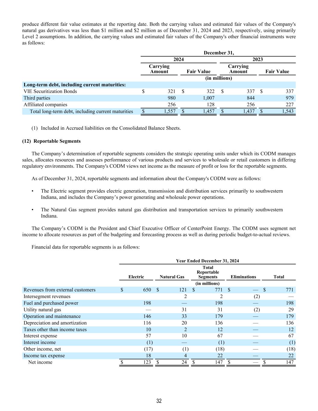produce different fair value estimates at the reporting date. Both the carrying values and estimated fair values of the Company's natural gas derivatives was less than $1 million and $2 million as of December 31, 2024 and 2023, respectively, using primarily Level 2 assumptions. In addition, the carrying values and estimated fair values of the Company's other financial instruments were as follows: December 31, 2024 2023 Carrying Amount Fair Value Carrying Amount Fair Value (in millions) Long-term debt, including current maturities: VIE Securitization Bonds $ 321 $ 322 $ 337 $ 337 Third parties 980 1,007 844 979 Affiliated companies 256 128 256 227 Total long-term debt, including current maturities $ 1,557 $ 1,457 $ 1,437 $ 1,543 (1) Included in Accrued liabilities on the Consolidated Balance Sheets. (12) Reportable Segments The Company’s determination of reportable segments considers the strategic operating units under which its CODM manages sales, allocates resources and assesses performance of various products and services to wholesale or retail customers in differing regulatory environments. The Company's CODM views net income as the measure of profit or loss for the reportable segments. As of December 31, 2024, reportable segments and information about the Company's CODM were as follows: • The Electric segment provides electric generation, transmission and distribution services primarily to southwestern Indiana, and includes the Company’s power generating and wholesale power operations. • The Natural Gas segment provides natural gas distribution and transportation services to primarily southwestern Indiana. The Company’s CODM is the President and Chief Executive Officer of CenterPoint Energy. The CODM uses segment net income to allocate resources as part of the budgeting and forecasting process as well as during periodic budget-to-actual reviews. Financial data for reportable segments is as follows: Year Ended December 31, 2024 Electric Natural Gas Total Reportable Segments Eliminations Total (in millions) Revenues from external customers $ 650 $ 121 $ 771 $ — $ 771 Intersegment revenues 2 2 (2) — Fuel and purchased power 198 — 198 — 198 Utility natural gas — 31 31 (2) 29 Operation and maintenance 146 33 179 — 179 Depreciation and amortization 116 20 136 — 136 Taxes other than income taxes 10 2 12 — 12 Interest expense 57 10 67 — 67 Interest income (1) — (1) — (1) Other income, net (17) (1) (18) — (18) Income tax expense 18 4 22 — 22 Net income $ 123 $ 24 $ 147 $ — $ 147 32