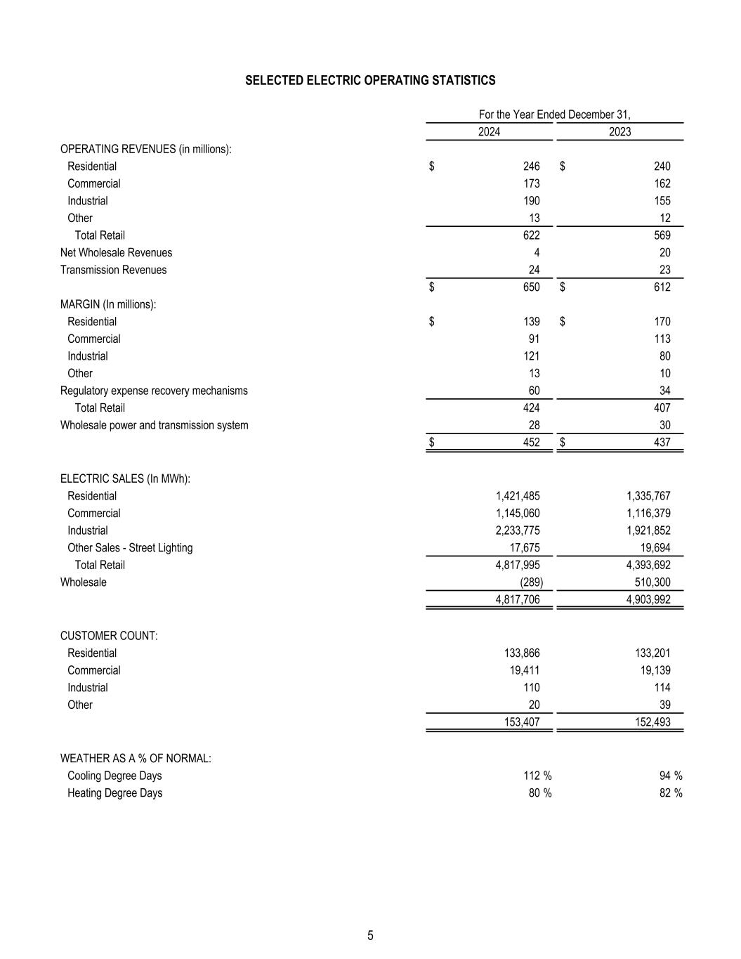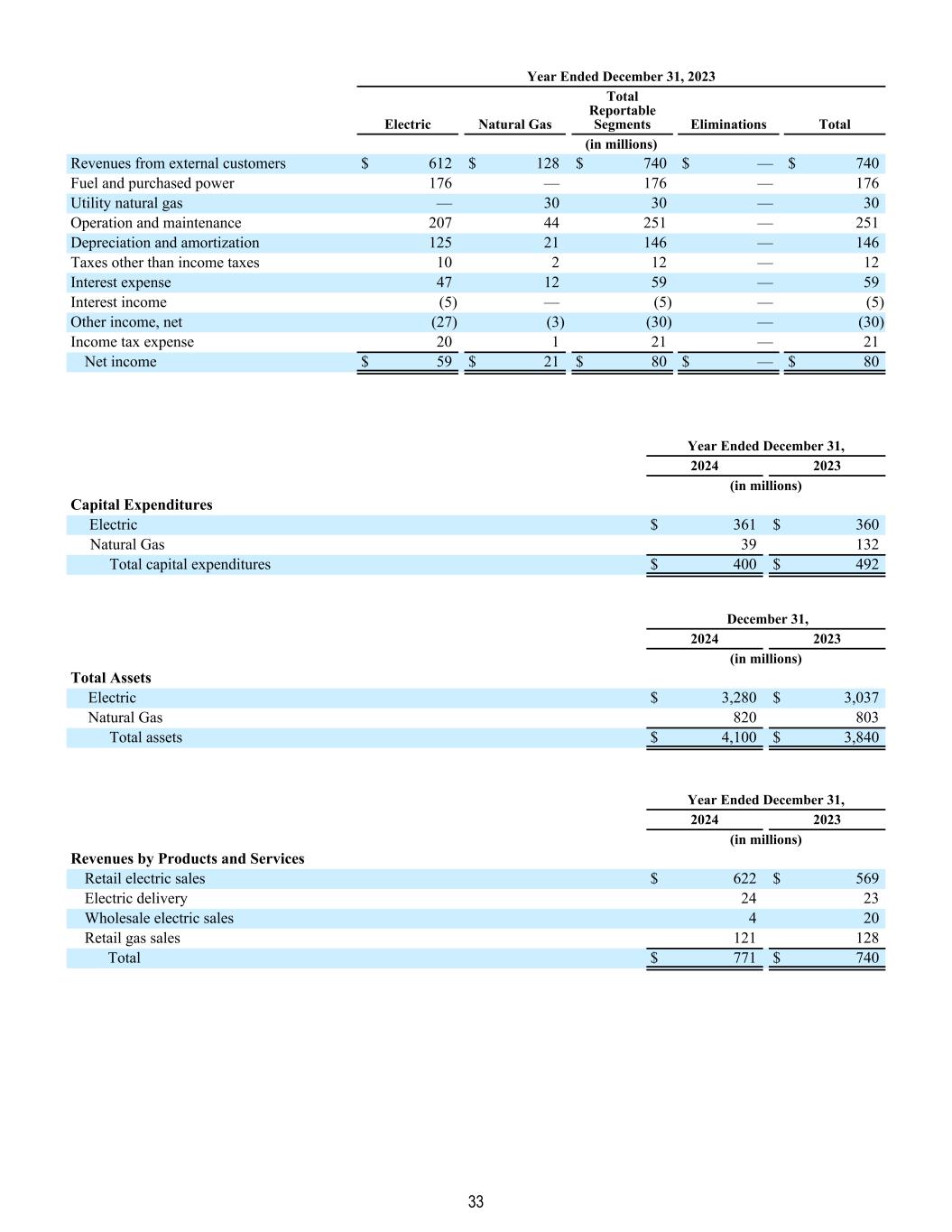 Year Ended December 31, 2023 Electric Natural Gas Total Reportable Segments Eliminations Total (in millions) Revenues from external customers $ 612 $ 128 $ 740 $ — $ 740 Fuel and purchased power 176 — 176 — 176 Utility natural gas — 30 30 — 30 Operation and maintenance 207 44 251 — 251 Depreciation and amortization 125 21 146 — 146 Taxes other than income taxes 10 2 12 — 12 Interest expense 47 12 59 — 59 Interest income (5) — (5) — (5) Other income, net (27) (3) (30) — (30) Income tax expense 20 1 21 — 21 Net income $ 59 $ 21 $ 80 $ — $ 80 Year Ended December 31, 2024 2023 (in millions) Capital Expenditures Electric $ 361 $ 360 Natural Gas 39 132 Total capital expenditures $ 400 $ 492 December 31, 2024 2023 (in millions) Total Assets Electric $ 3,280 $ 3,037 Natural Gas 820 803 Total assets $ 4,100 $ 3,840 Year Ended December 31, 2024 2023 (in millions) Revenues by Products and Services Retail electric sales $ 622 $ 569 Electric delivery 24 23 Wholesale electric sales 4 20 Retail gas sales 121 128 Total $ 771 $ 740 33
