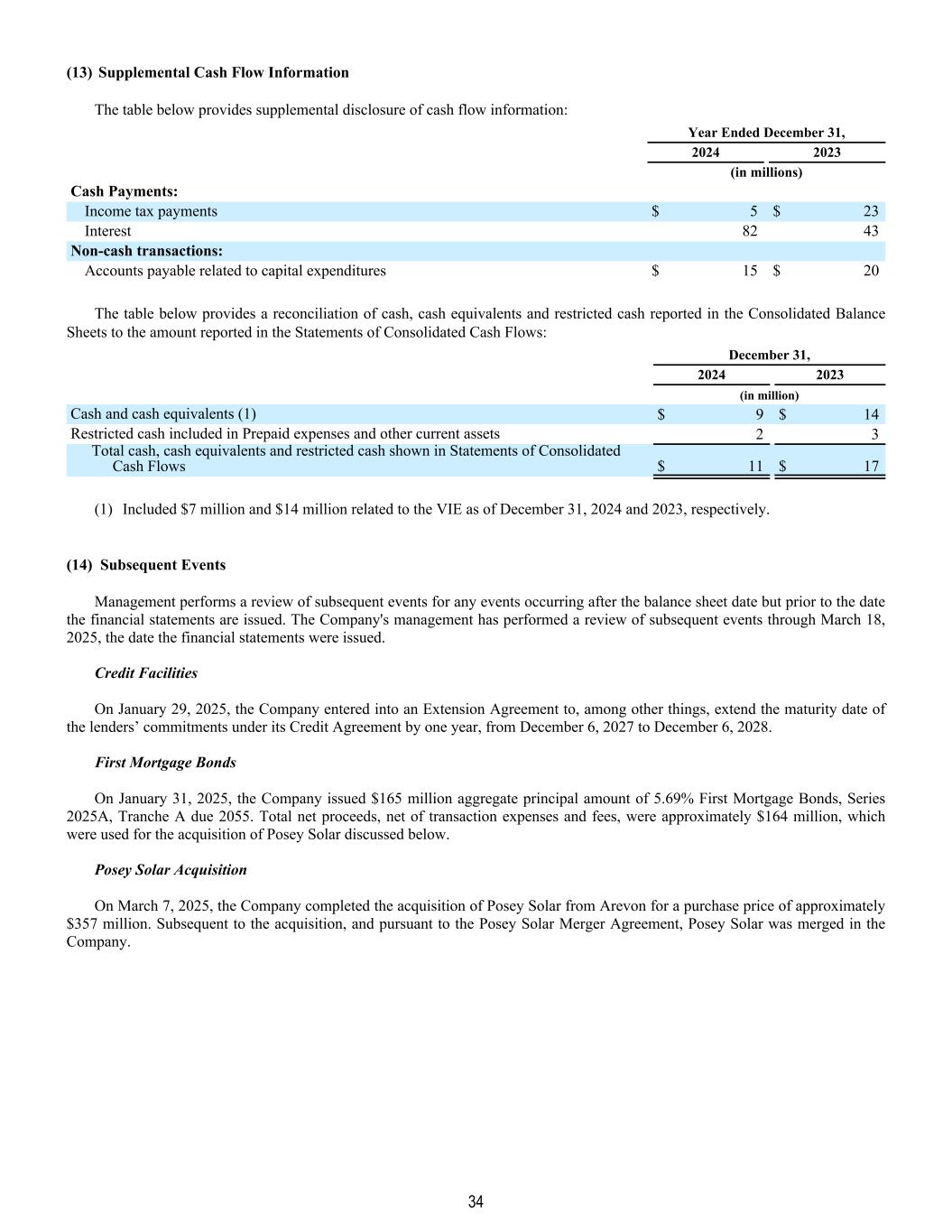 (13) Supplemental Cash Flow Information The table below provides supplemental disclosure of cash flow information: Year Ended December 31, 2024 2023 (in millions) Cash Payments: Income tax payments $ 5 $ 23 Interest 82 43 Non-cash transactions: Accounts payable related to capital expenditures $ 15 $ 20 The table below provides a reconciliation of cash, cash equivalents and restricted cash reported in the Consolidated Balance Sheets to the amount reported in the Statements of Consolidated Cash Flows: December 31, 2024 2023 (in million) Cash and cash equivalents (1) $ 9 $ 14 Restricted cash included in Prepaid expenses and other current assets 2 3 Total cash, cash equivalents and restricted cash shown in Statements of Consolidated Cash Flows $ 11 $ 17 (1) Included $7 million and $14 million related to the VIE as of December 31, 2024 and 2023, respectively. (14) Subsequent Events Management performs a review of subsequent events for any events occurring after the balance sheet date but prior to the date the financial statements are issued. The Company's management has performed a review of subsequent events through March 18, 2025, the date the financial statements were issued. Credit Facilities On January 29, 2025, the Company entered into an Extension Agreement to, among other things, extend the maturity date of the lenders’ commitments under its Credit Agreement by one year, from December 6, 2027 to December 6, 2028. First Mortgage Bonds On January 31, 2025, the Company issued $165 million aggregate principal amount of 5.69% First Mortgage Bonds, Series 2025A, Tranche A due 2055. Total net proceeds, net of transaction expenses and fees, were approximately $164 million, which were used for the acquisition of Posey Solar discussed below. Posey Solar Acquisition On March 7, 2025, the Company completed the acquisition of Posey Solar from Arevon for a purchase price of approximately $357 million. Subsequent to the acquisition, and pursuant to the Posey Solar Merger Agreement, Posey Solar was merged in the Company. 34